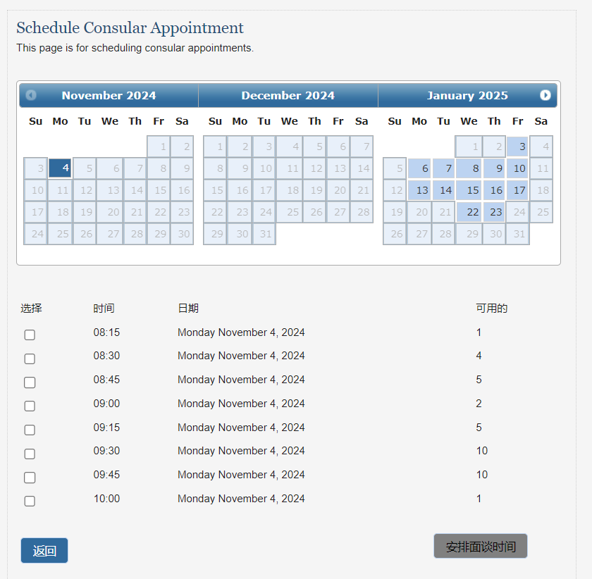我上个月约面签的时候12月还是有很多位置的,估计这段时间回去的人多,都被抢完了