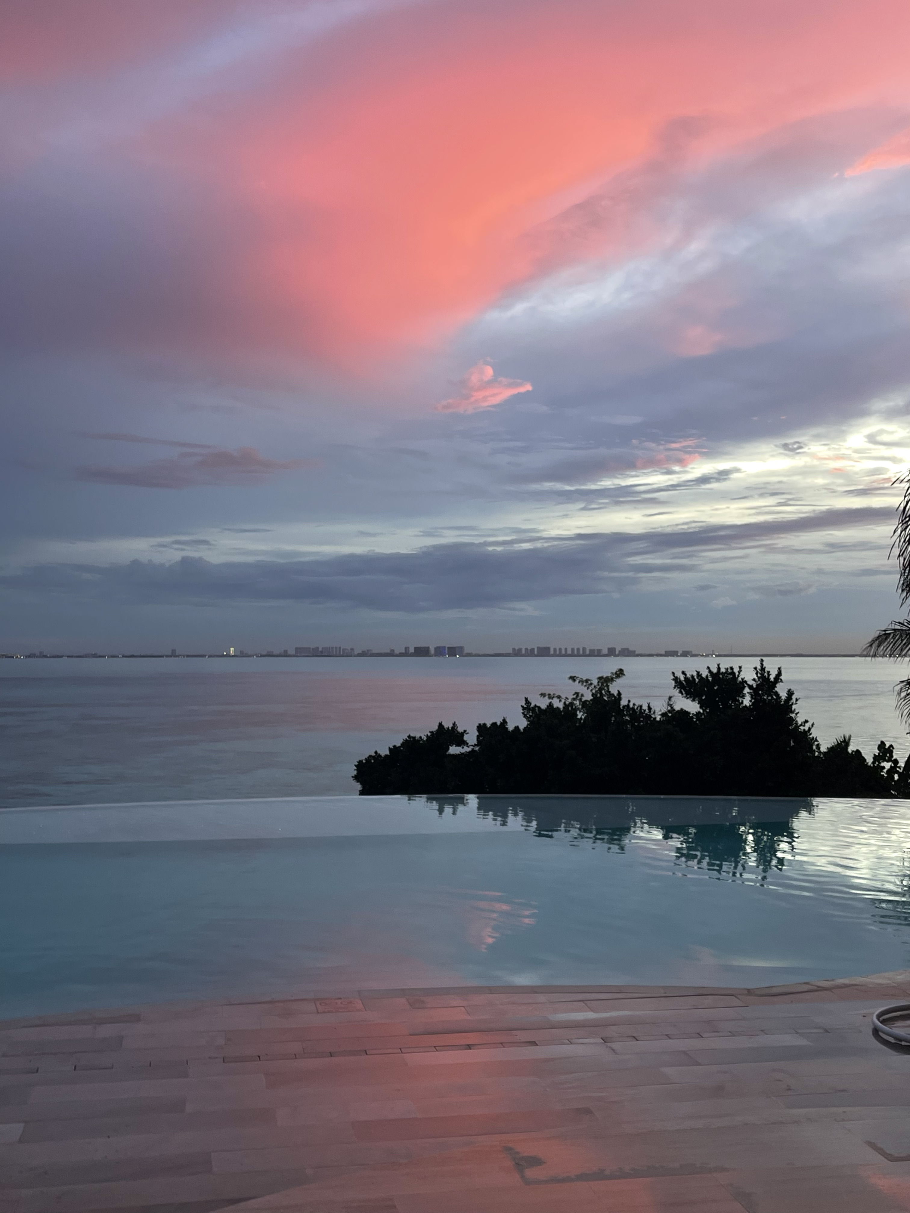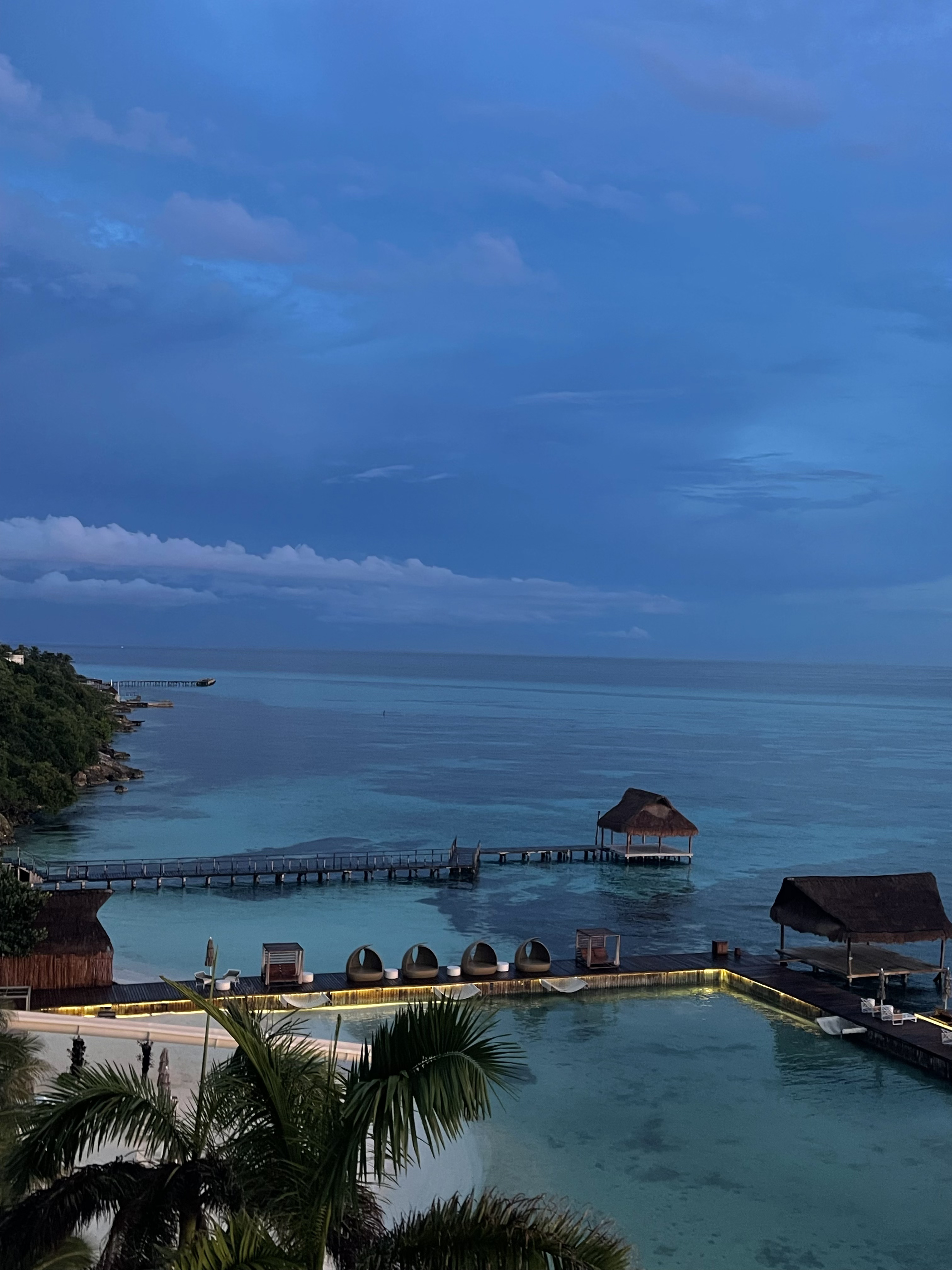 酒店各个部分的风景都非常好,沙滩边就不用说了,水很清澈,经常在海边一躺就是大半天,整个酒店还有很多不同的泳池,最喜欢的是大堂level的无边泳池,因为去的时候是9月,看天气预报还是有很多下雨的时候,不知道是不是因为运气好在酒店一共就碰到下了30min,但很多时候能看到远处的坎昆上乌云密布,在泳池里看这样的海景也是另一种感觉。