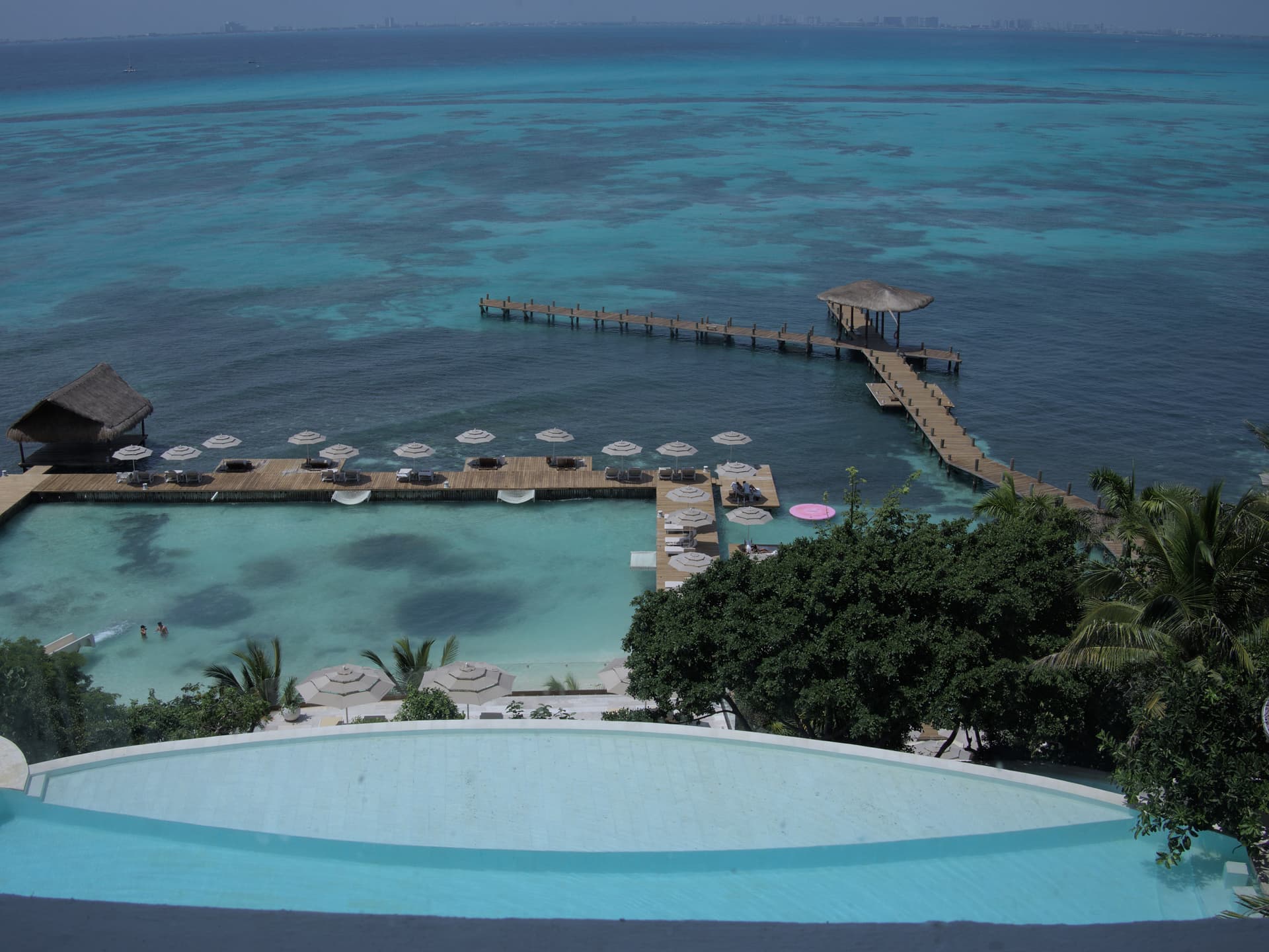 酒店本身在坎昆附近的女人岛上,每两小时就有一艘酒店自己的游艇穿梭在坎昆和女人岛之间,入住的几天前会收到酒店的confirmation email来确认飞机到达的时间。我们到达的时候正好赶上出租车司机罢工,把机场附近的交通堵了个水泄不通,到码头的时候酒店的船刚开走不久,只能在码头硬等2h。有一个点是在网上订车的时候,如果选择Impression Isla Mujeres经常会给你导航到另一个码头,是大船的码头,和酒店自己的小船是两个不同的地方,一定要和酒店和订车的多次confirm才可以。