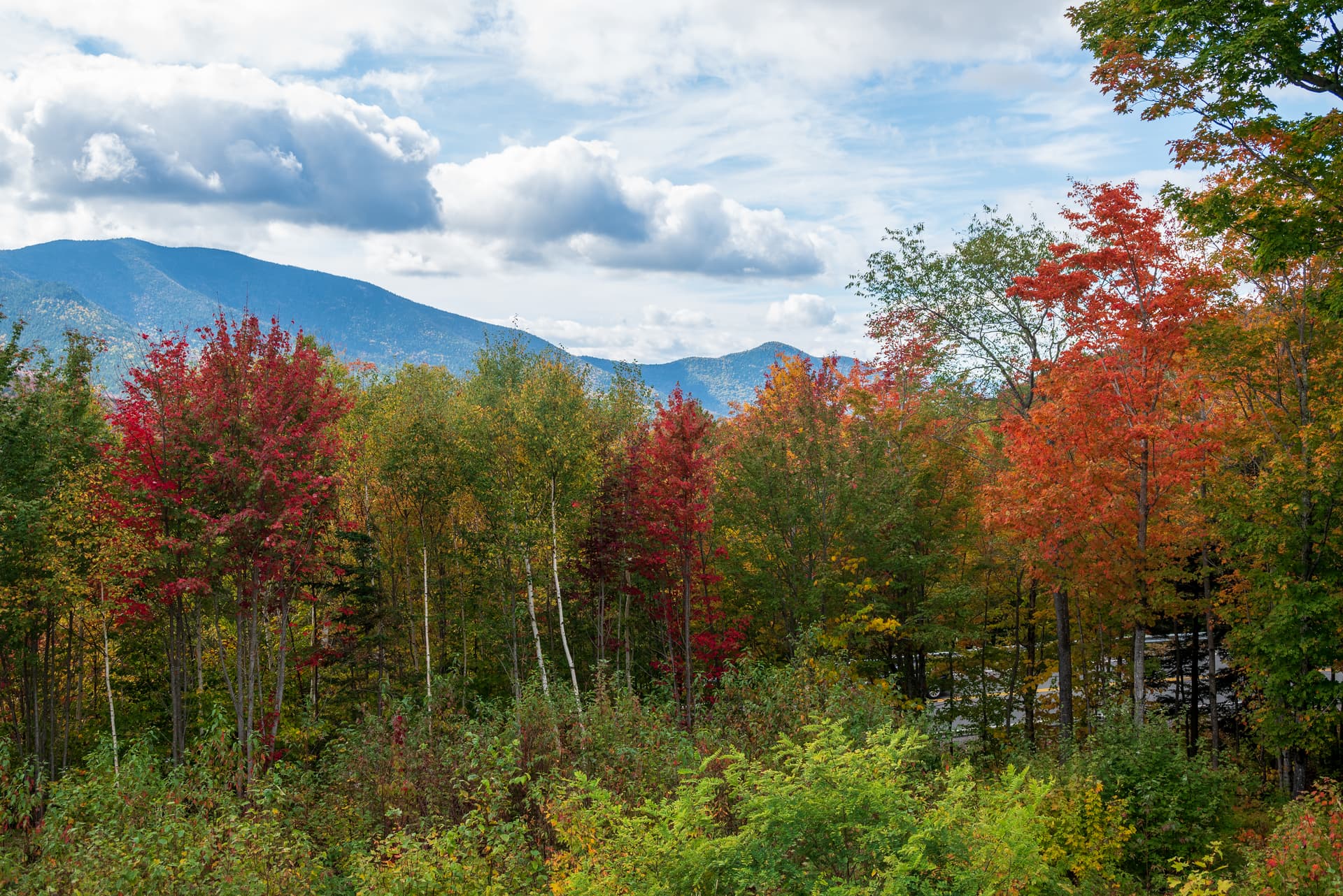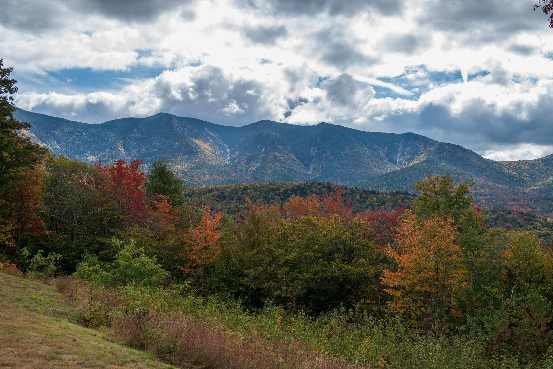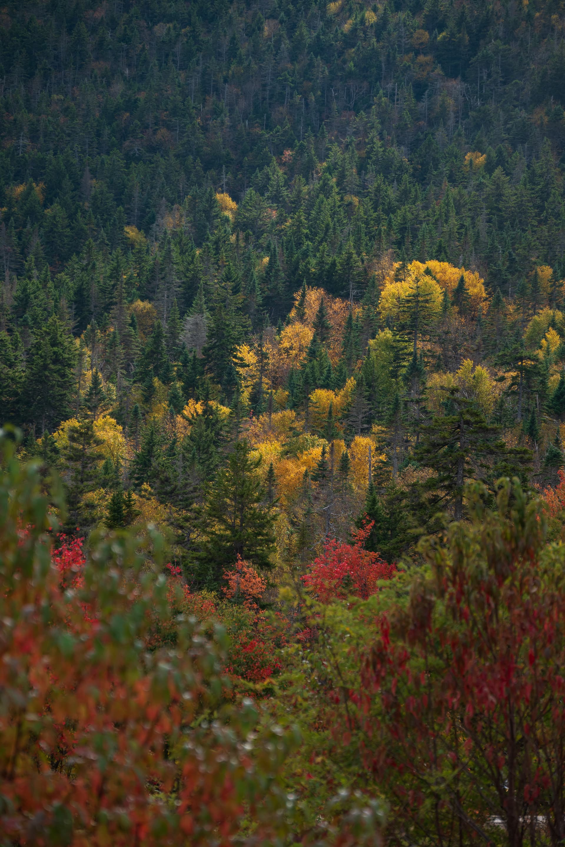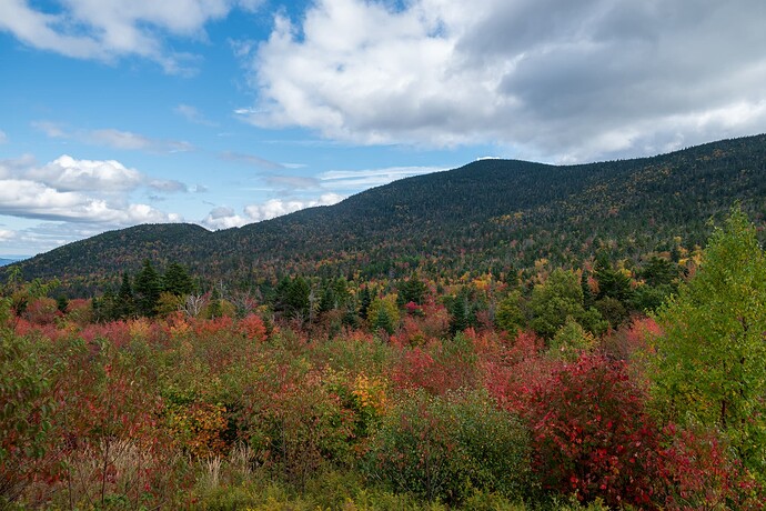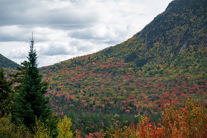 从Crawford notch往北开,经过Bretton Woods那一段东侧的山脉似乎是沿途见到过红得最多的,不知道和总统山脉导致的局部水汽有何关系,但是我们没有无人机 + 沿途没有特别合适的观景点就没有停下来欣赏。大致是Mount Deception, Dartmouth, Mitten这些区域吧。