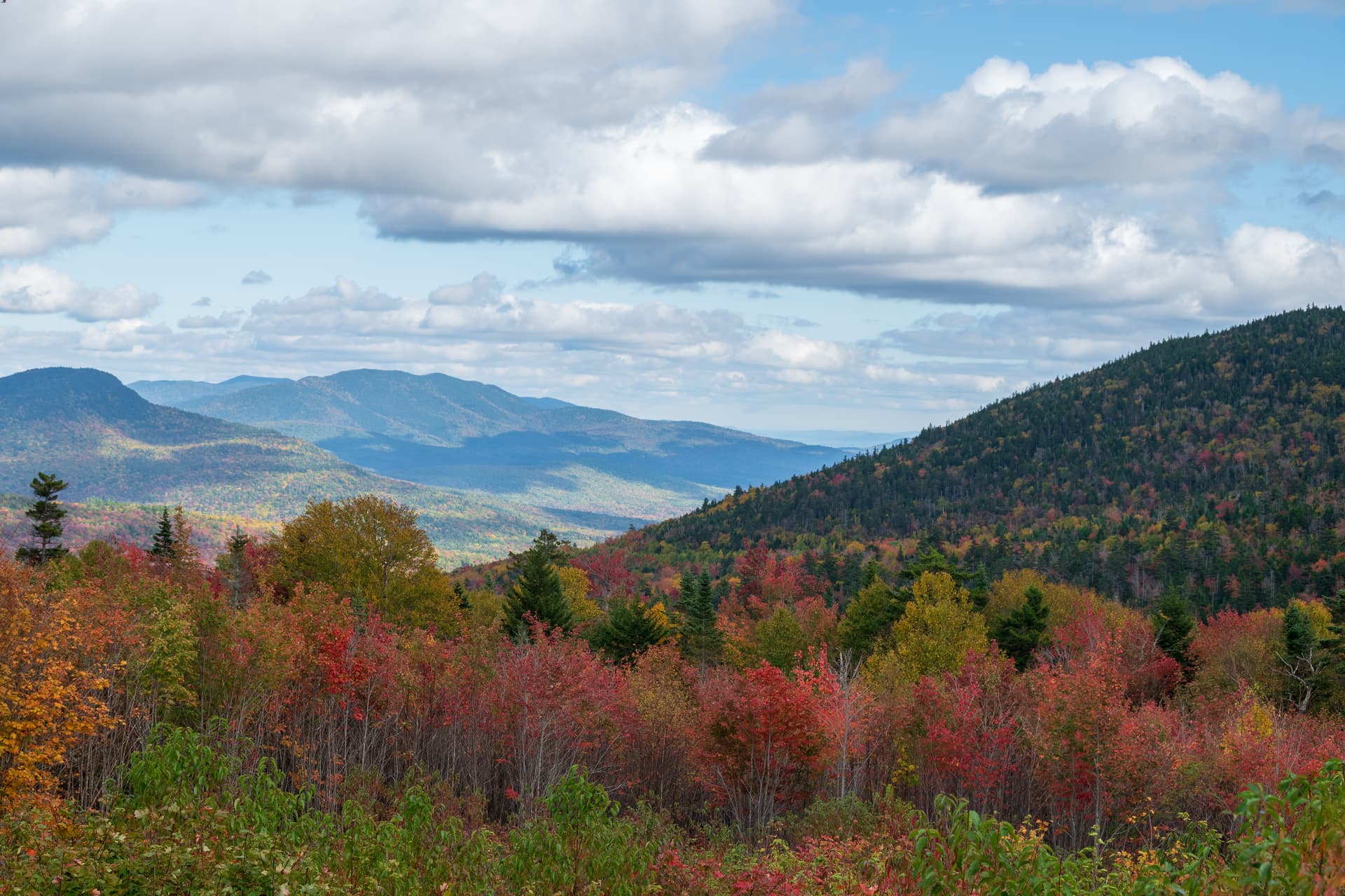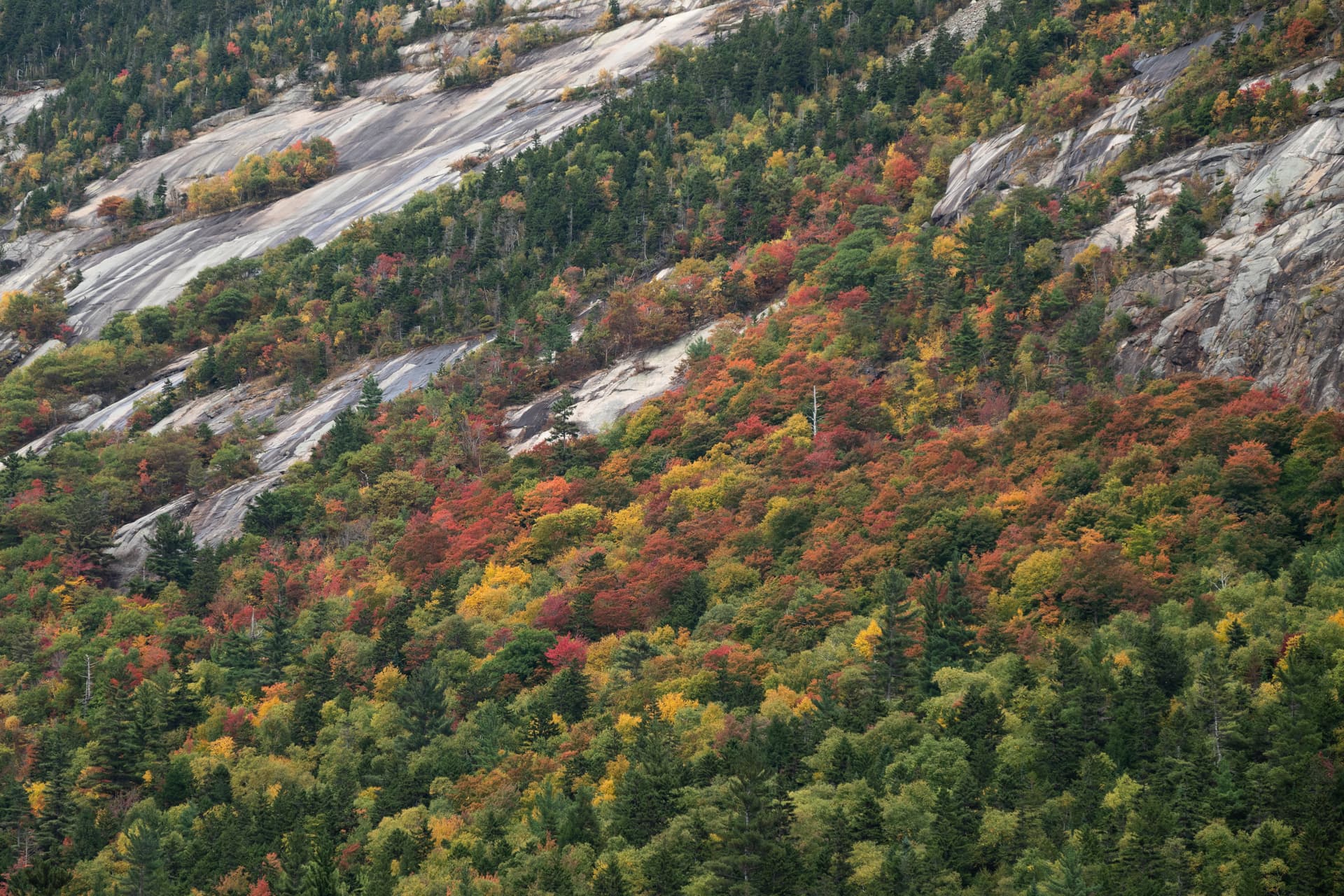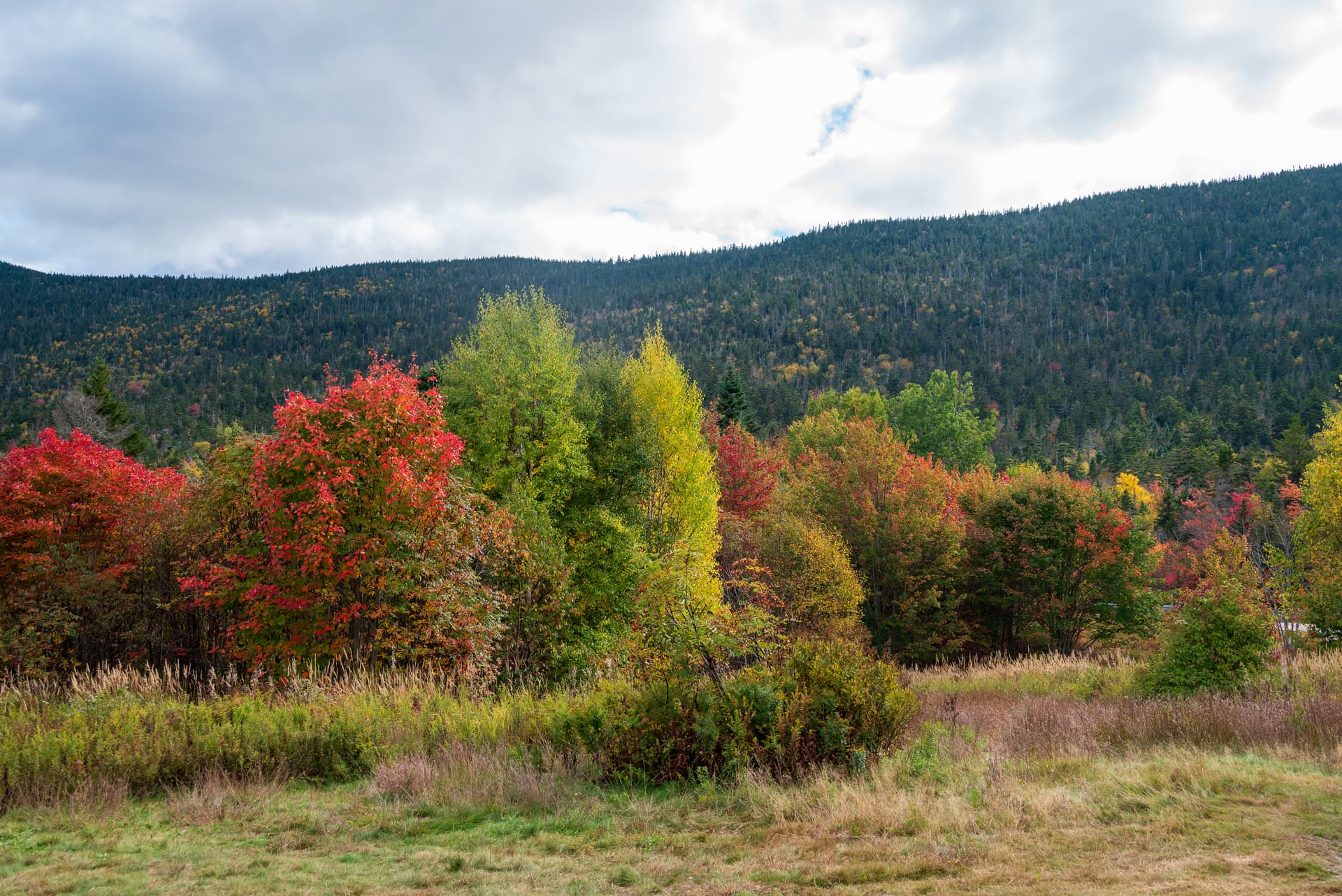 从Crawford notch往北开,经过Bretton Woods那一段东侧的山脉似乎是沿途见到过红得最多的,不知道和总统山脉导致的局部水汽有何关系,但是我们没有无人机 + 沿途没有特别合适的观景点就没有停下来欣赏。大致是Mount Deception, Dartmouth, Mitten这些区域吧。