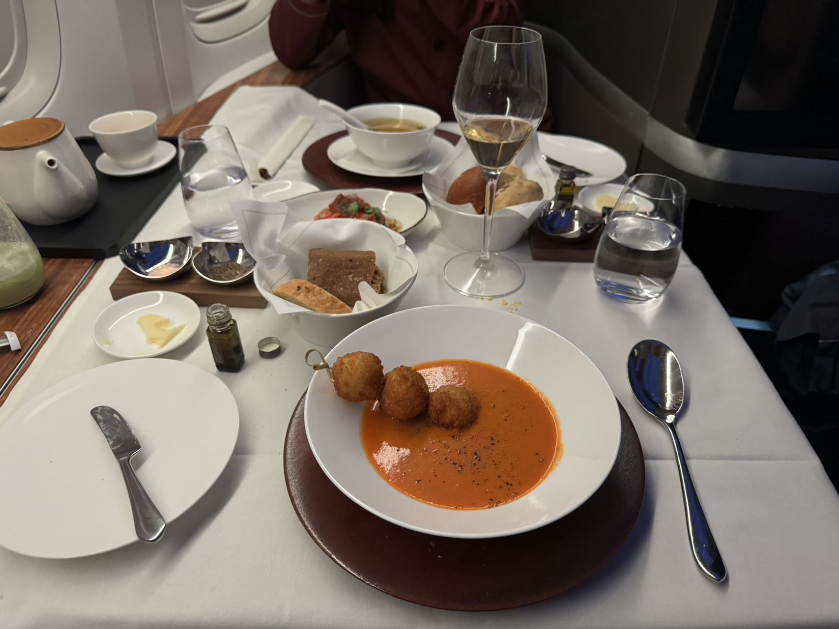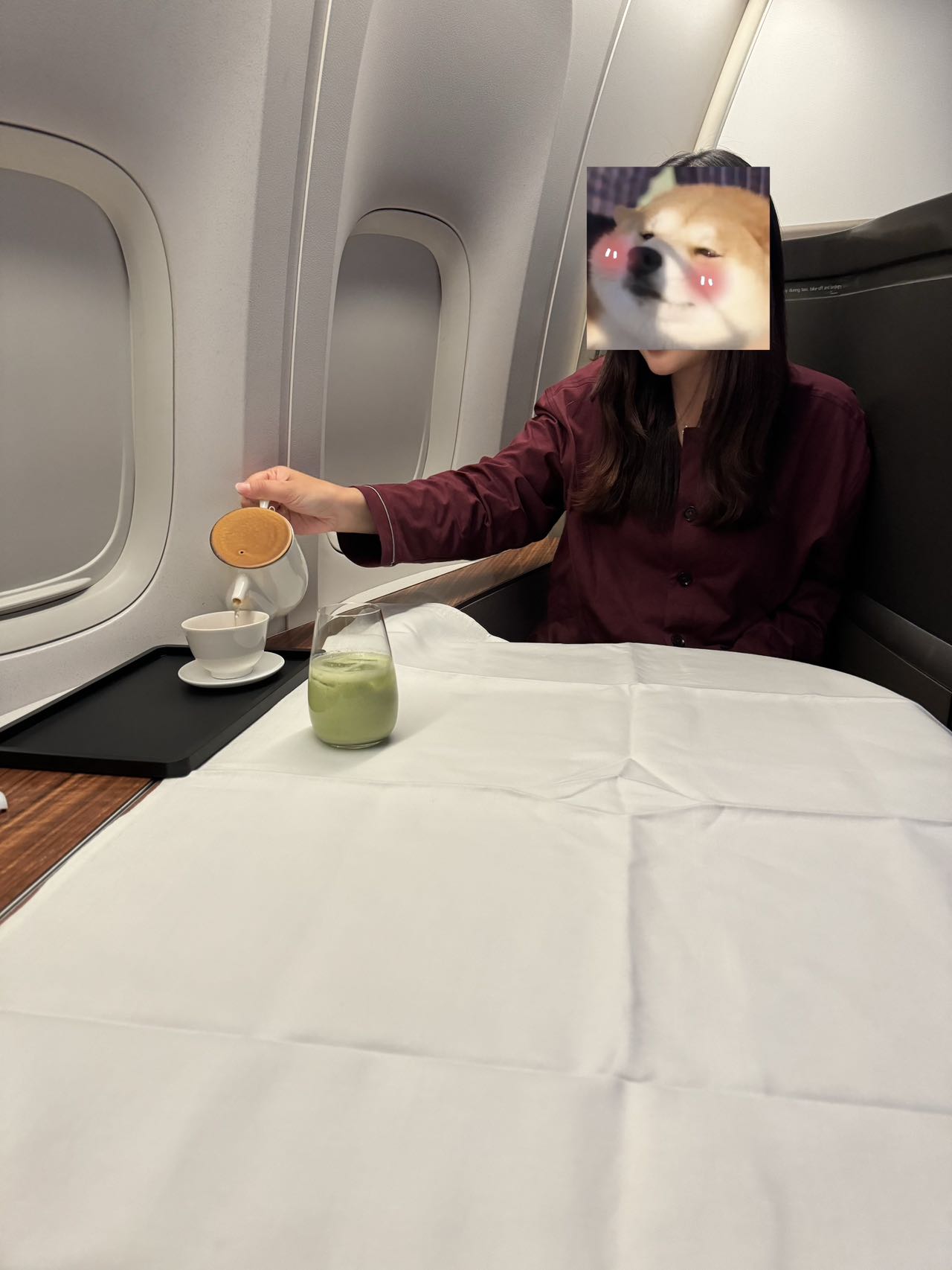0点起飞的航班就是,上飞机后吃个饭,吃的时候都困到不行了,最后终于3点左右吃完可以洗漱睡觉,国泰的头等的洗漱包比商务的好看好多,带走带走,睡衣吃饭ld穿着的红色的,好看好看,带走带走。隔壁4个位置应该是一家人带娃(什么有钱人),娃很乖,很少哭闹,但是爸爸的呼噜声震耳欲聋,快降落的时候醒来ld还笑我怎么睡得这么香,呼噜声这么大,错怪我了 ![]()