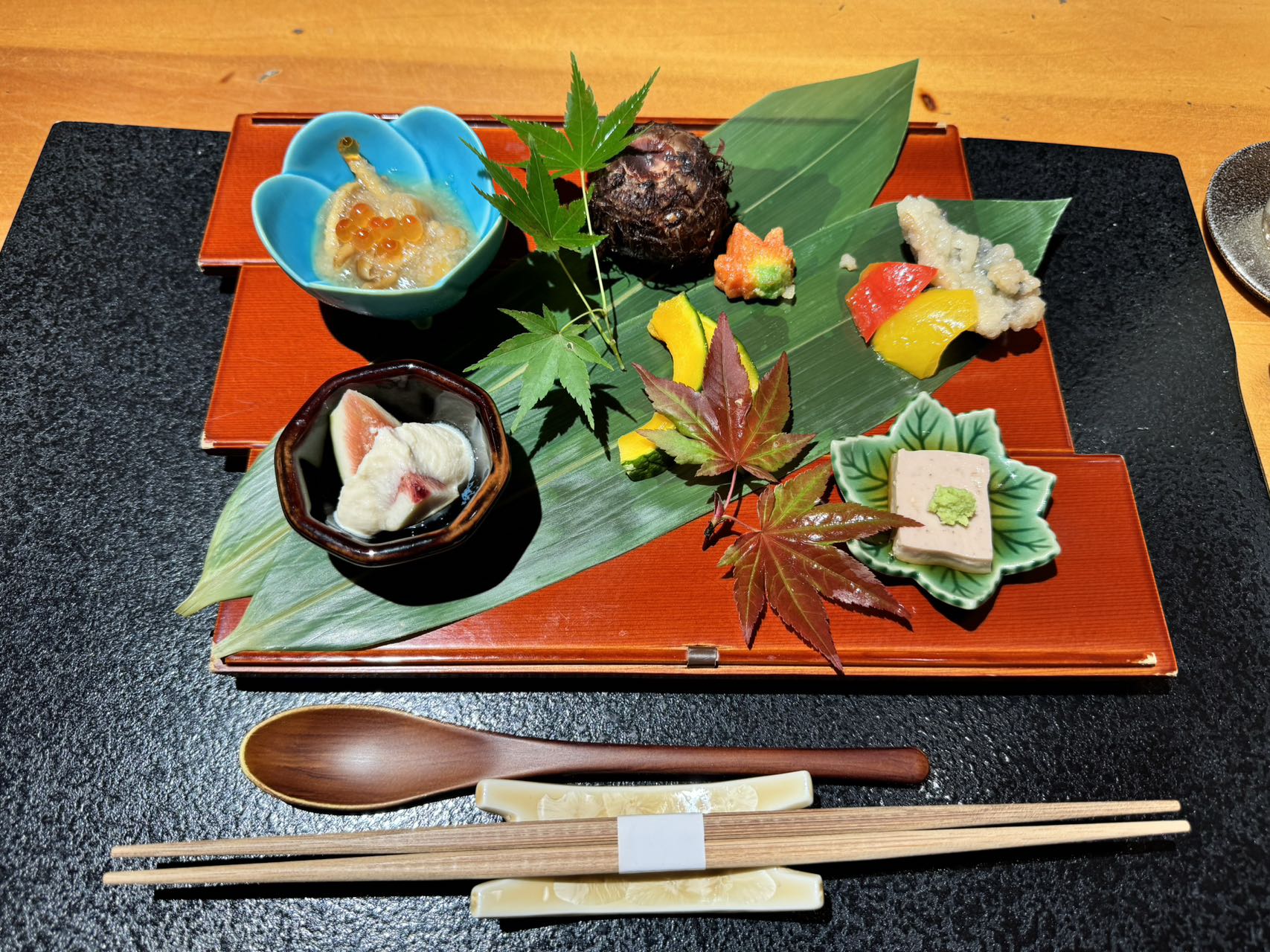 然后12点预约了一家石塀小路里的怀石料理午饭,Ishibe Koji Mamecha Kyoto (石塀小路豆ちゃ) 第一次吃怀石料理还挺期待的,这家评分一般,但是价格便宜,一个人7000多yen。
