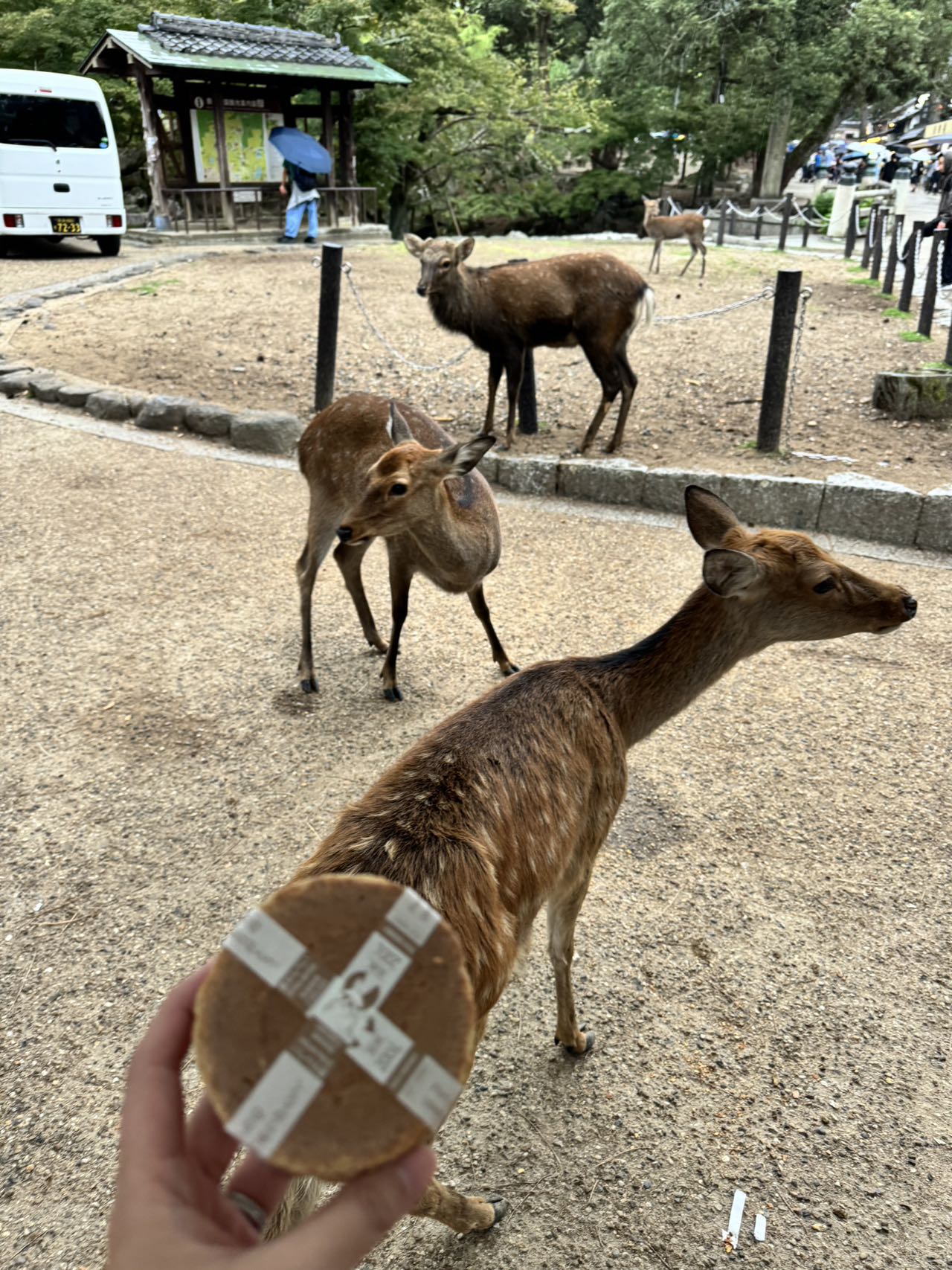 下午最后准备去奈良喂小鹿。到了kyoto station后坐Kintetsu Limited Express要额外加钱到奈良,奈良公园很大,很快就能看到好多小鹿,但是卖饼干的老奶奶有点难找,一般是在某个神社的门口会遇到,所以可以直接朝想去的神社出发,遍地都是小鹿,不用担心。买到饼干啦。
