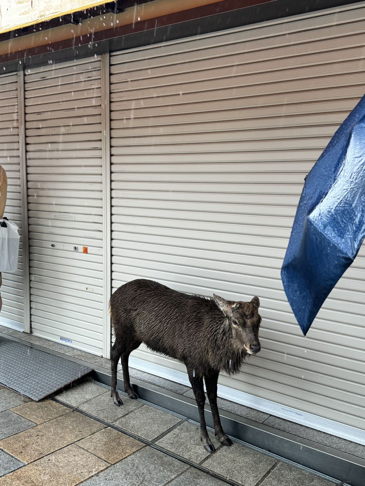 突然下起了大雨,在路边商店屋檐下躲雨的![]()
