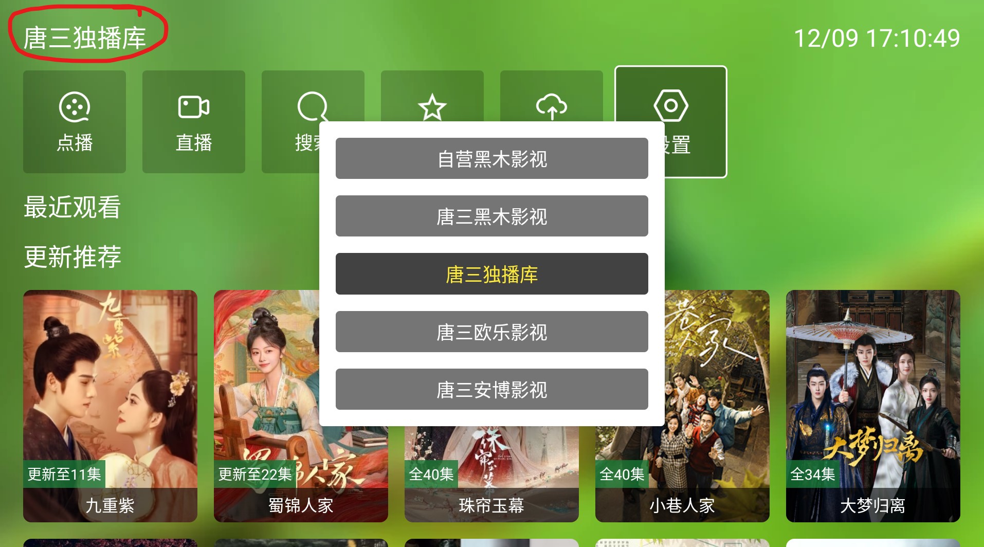 除了在左上角切换点播源,还可在设置中选择不同点播源和直播源。
