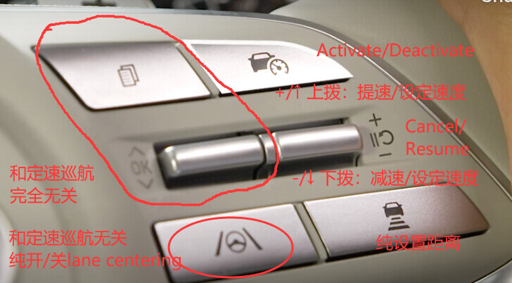没看懂。ACC就和普通CC一样,按一下Cruise激活,然后按Set就开始了啊。 上个方向盘照片好了……