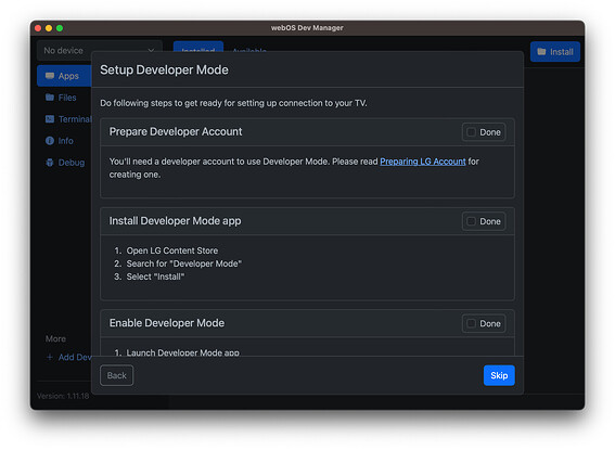 - 步骤 2:按照步骤创建 LG 开发者帐户,安装开发者模式应用并启用开发者模式。