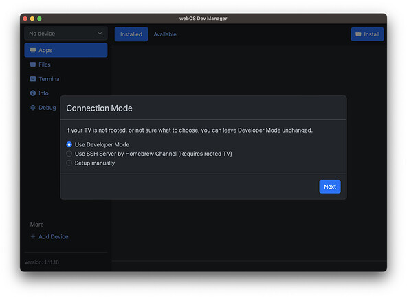 - 步骤 1:如果不确定,请选择开发者模式。按照步骤设置 LG 开发者帐户,安装开发者模式应用并启用它。或者,如果您的电视已经获得 Root 权限,您可以设置 SSH 连接并跳到步骤3。