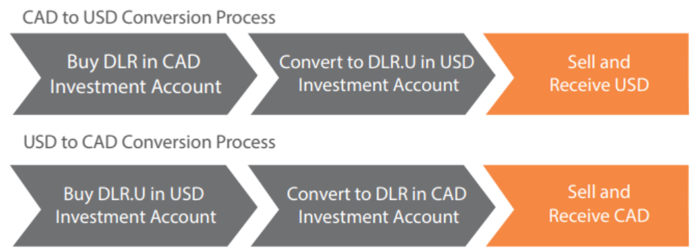 一言以蔽之,CAD买入DLR.TO,转换成DLR.U.TO,卖出DLR.U.TO得到USD。