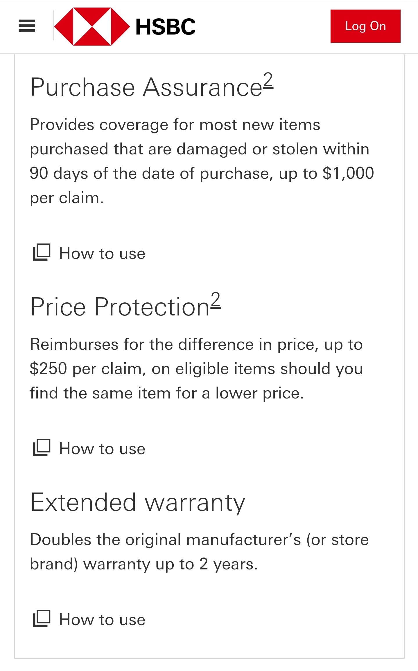 这个网页应该是过期的,通过HSBC主页的credit cards进去看到的benefits就没有后面三项了,Guide to benefits手册(这个应该是最准确的)里也没有这三个benefits。这三个benefits应该就是MasterCard给的,后来被统一取消了,MasterCard的www.mycardbenefits.com网站也已经没有对应的claim途径了。