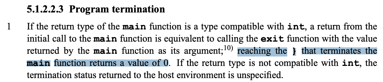 If control flows off the end of the compound-statement of main, the effect is equivalent to a return with operand 0 (see also [except.handle]).