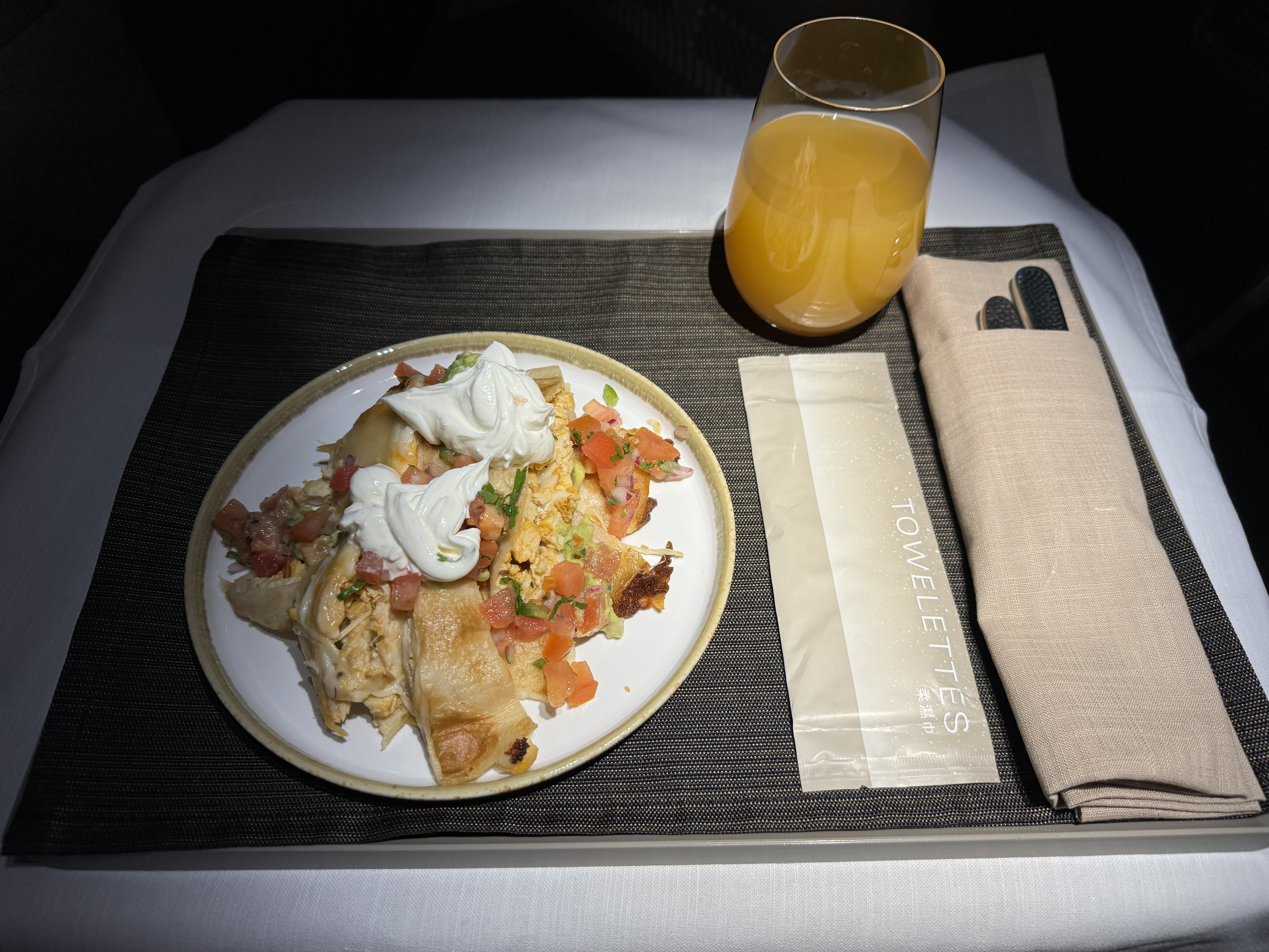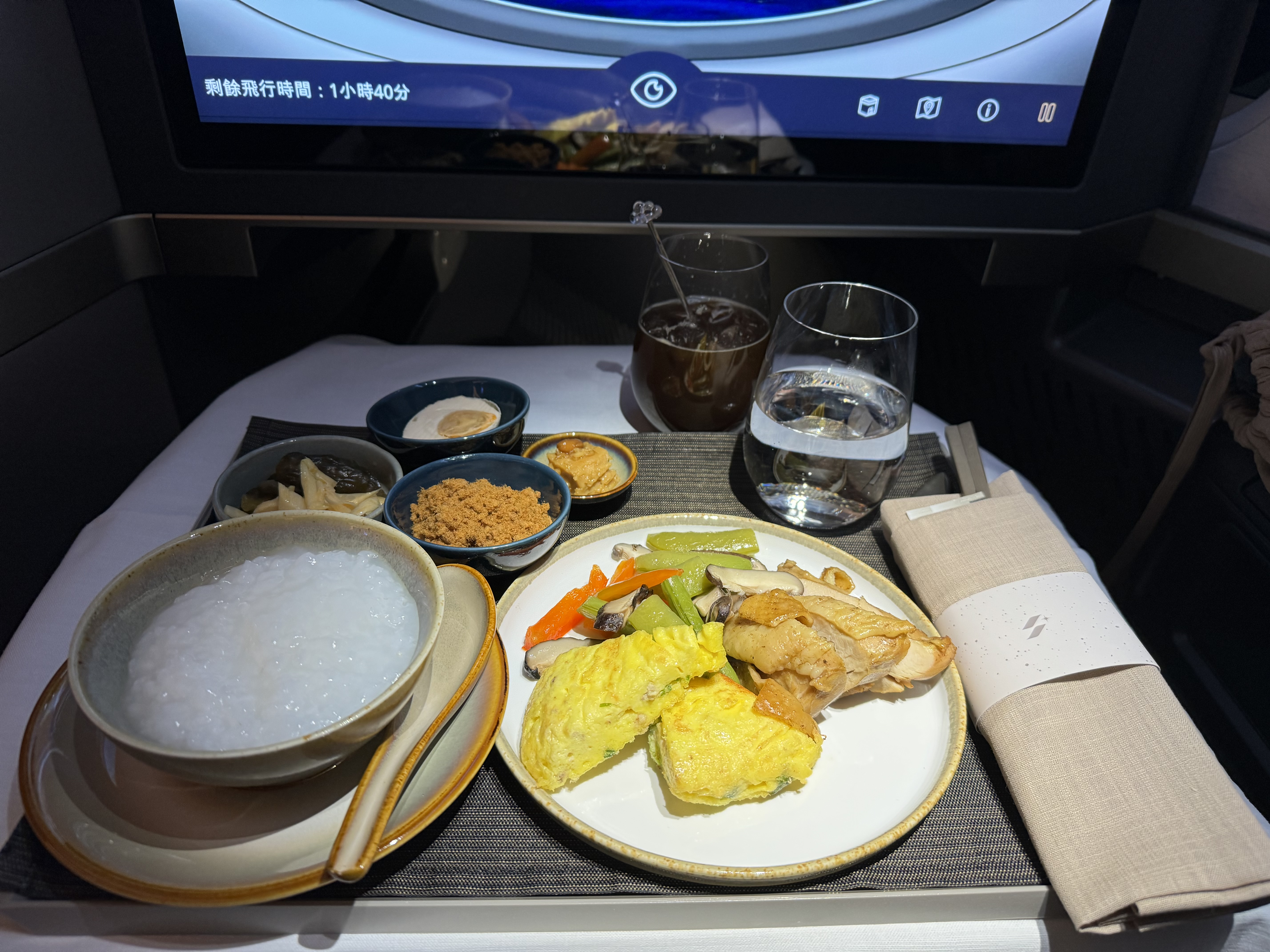 最后,降落前一个多小时提供简餐,选了白粥,搭配肉松、腐乳、咸菜和咸蛋。这一顿分量很小,如果前面没要quesadilla就得饿着肚子下飞机了!