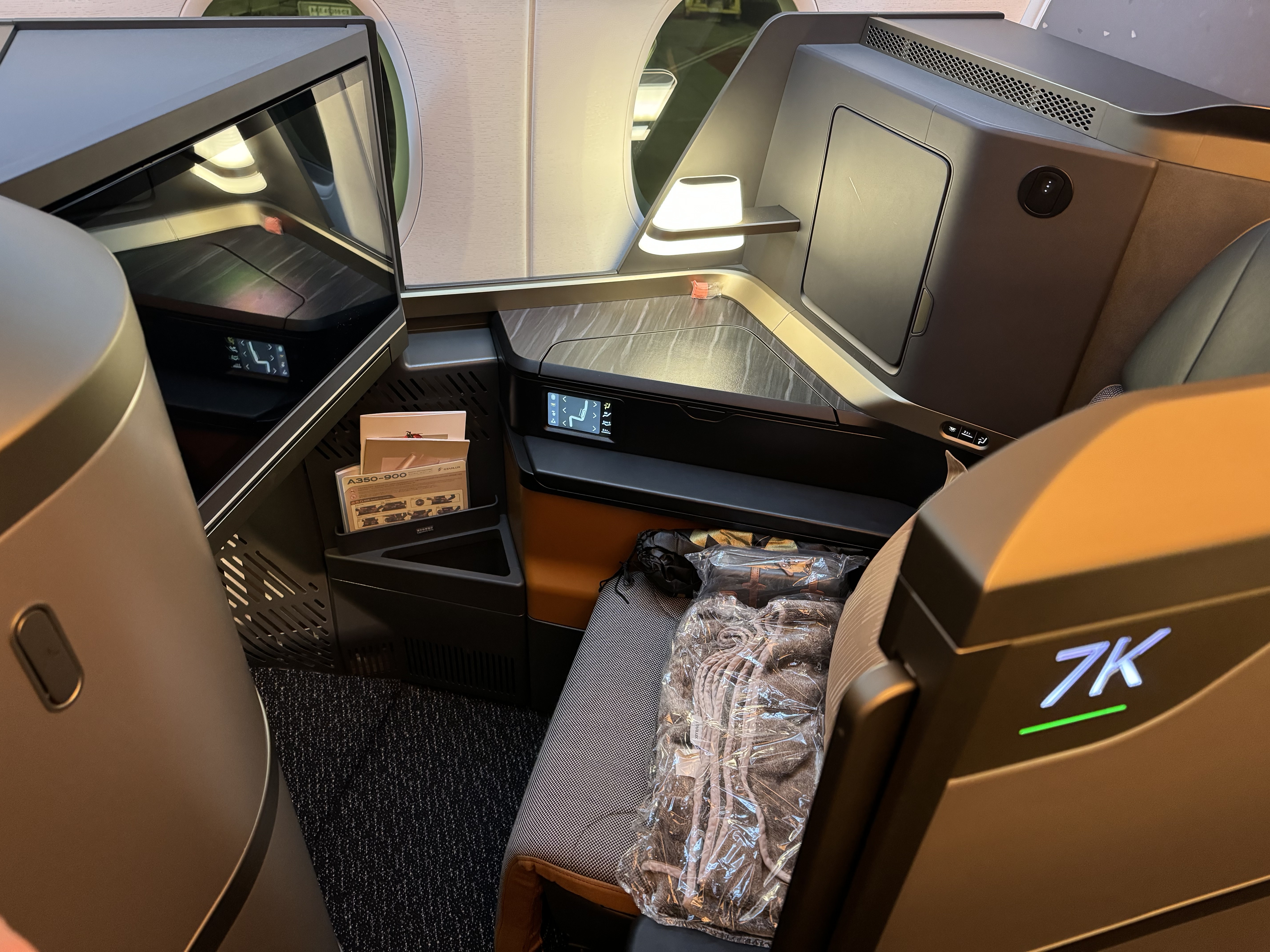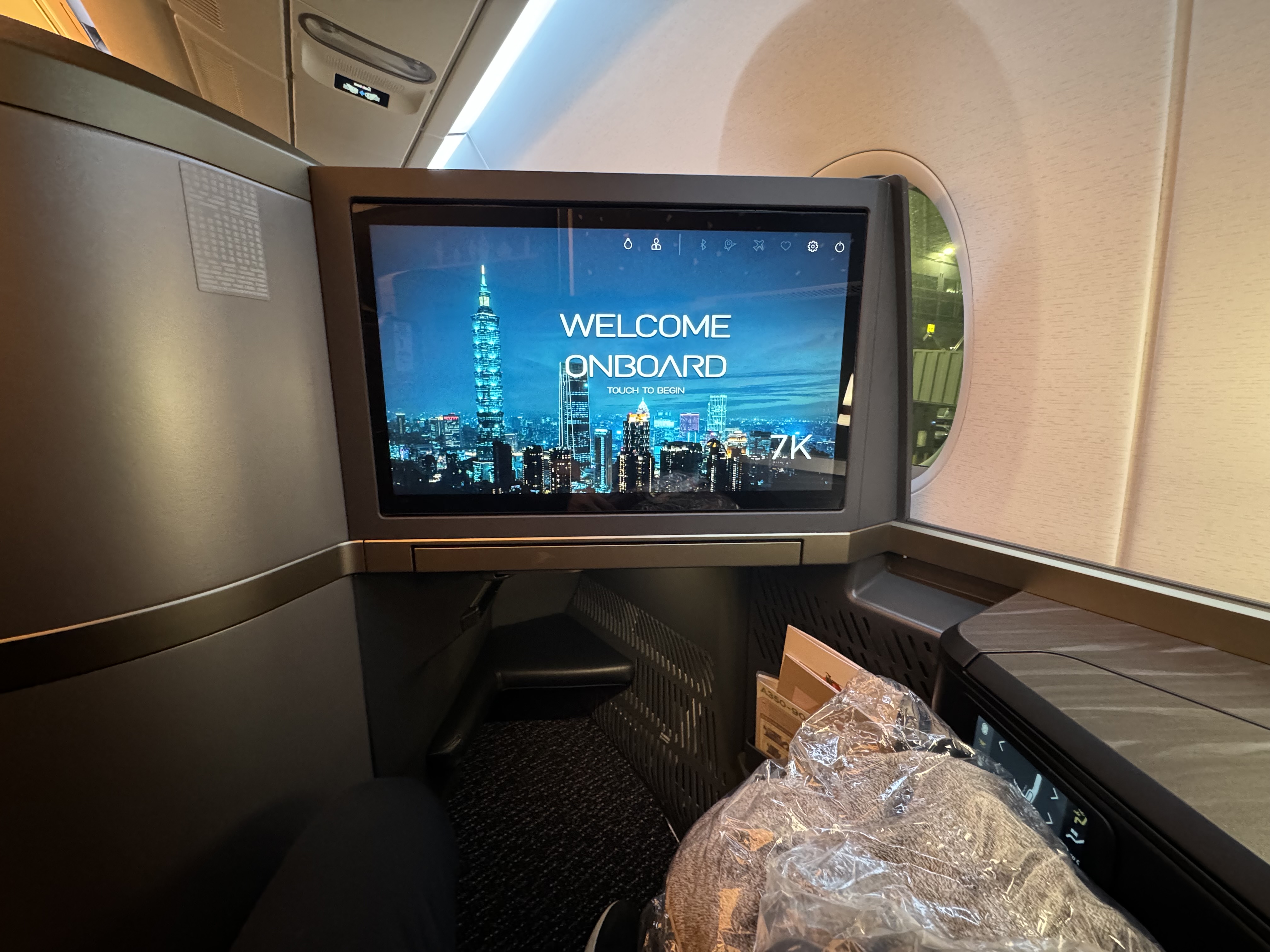 准点登机,1-2-1布局的小隔间,看起来不错,宽度也够。但我这个右侧靠窗座位有两个问题 1. 没有窗 2. 位子上还有上一程留下的糖纸,没清扫。