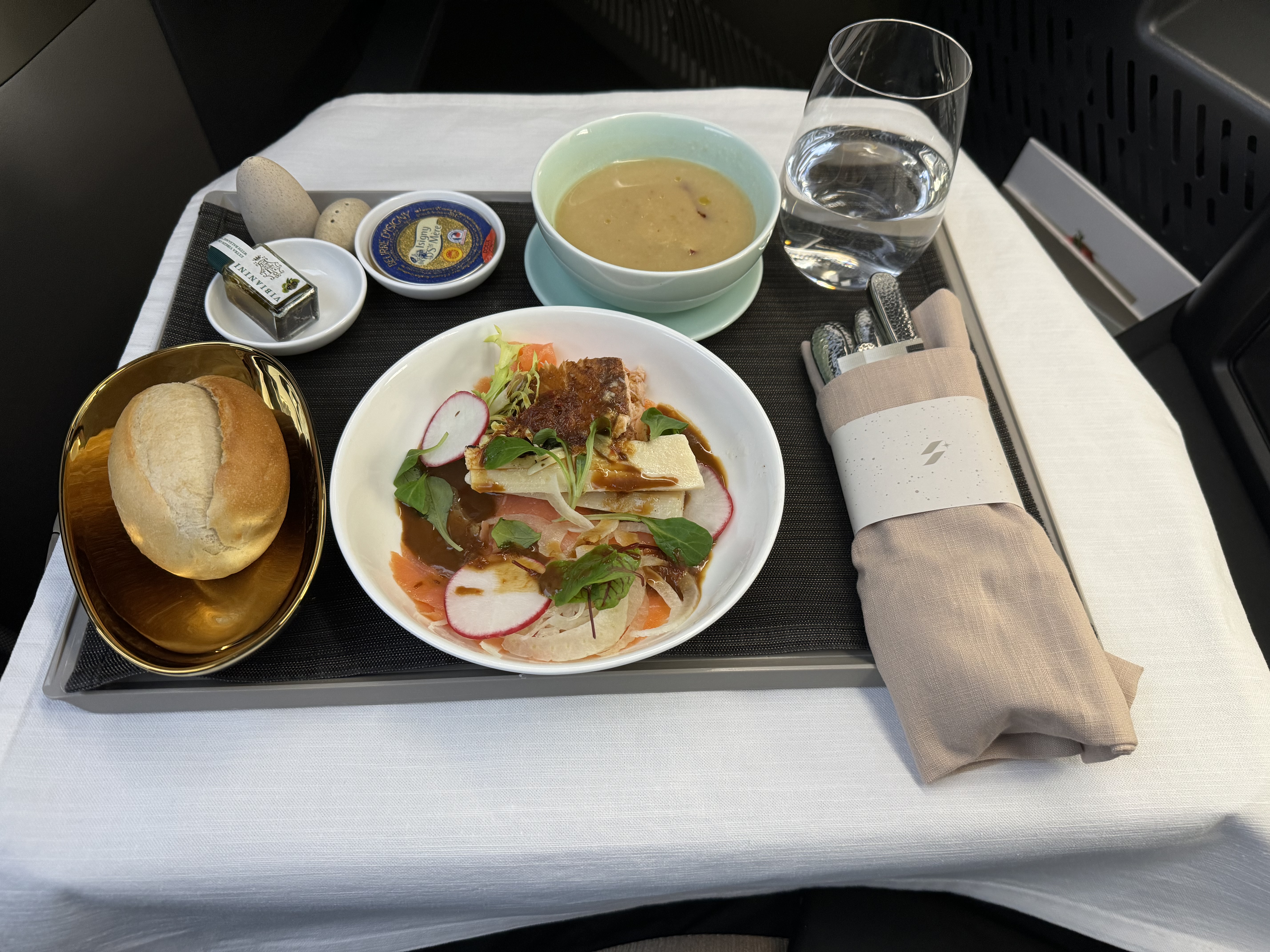 正餐前菜是个轻熏三文鱼+深熏三文鱼,挺好吃的。面包选择很少,没有garlic bread,汤一般比较creamy。