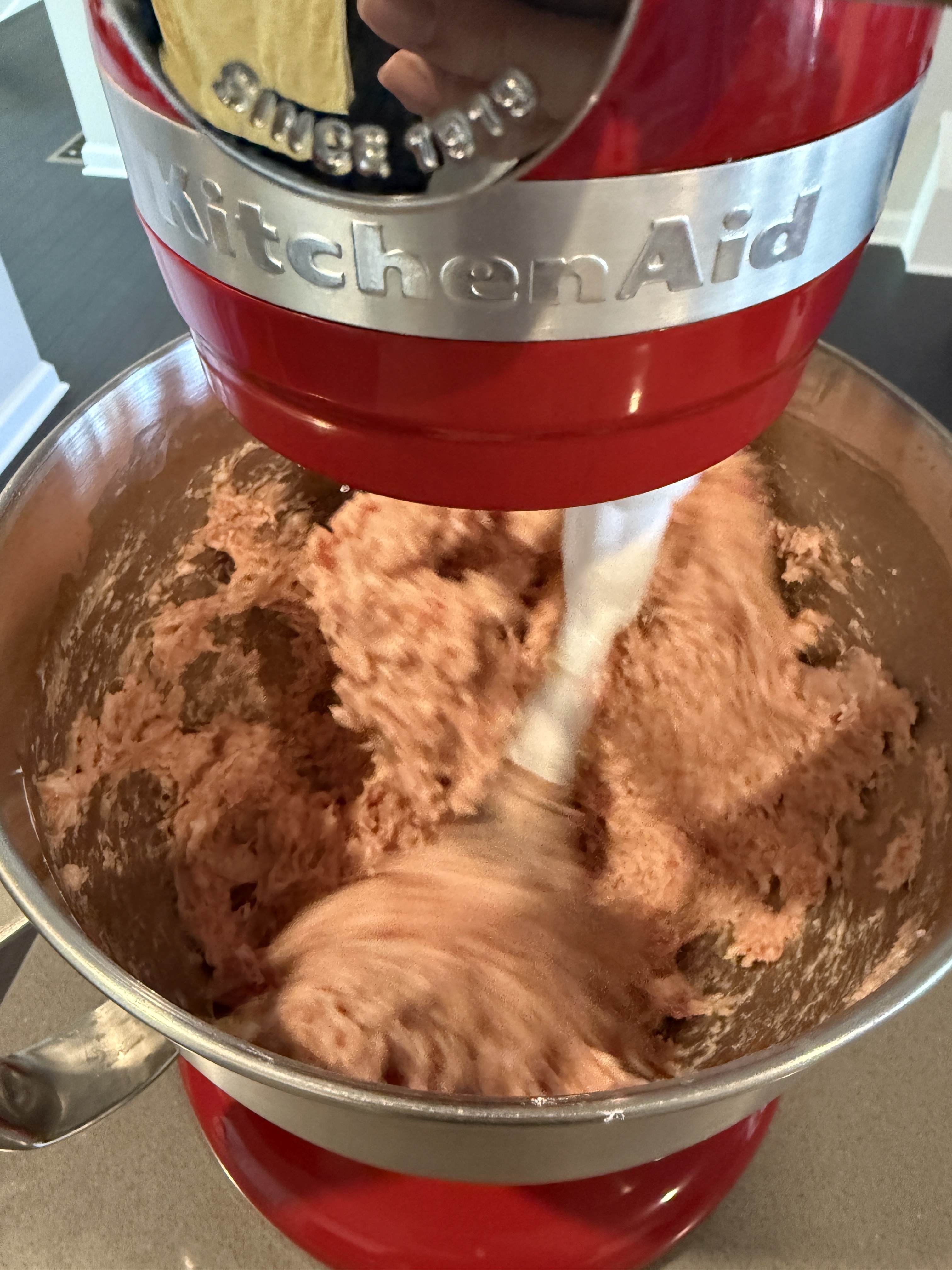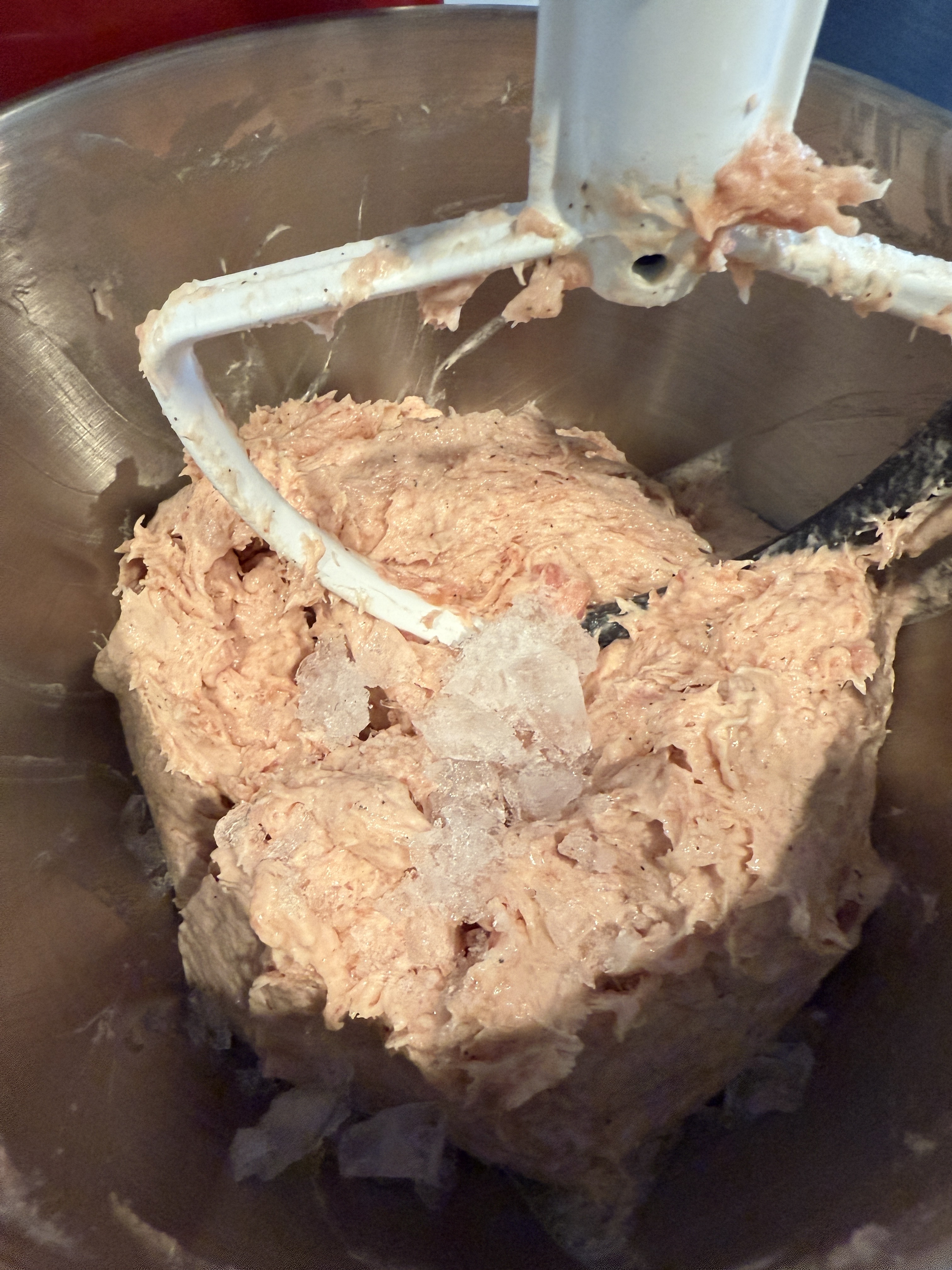 2小时后 把肉馅拿出来 放入厨师机的盆 倒入除冰块之外的所有调料,厨师机开1档 先把调理和肉馅充分混合,之后加入1/3冰块 2档继续打7分钟 再加入1/3冰块打10分钟,然后加入最后的冰块 继续3当打10分钟,打完之后肉馅应该是偏白的(如果喜欢脆皮肉肠是红红的颜色的话 可以加1g红曲粉)