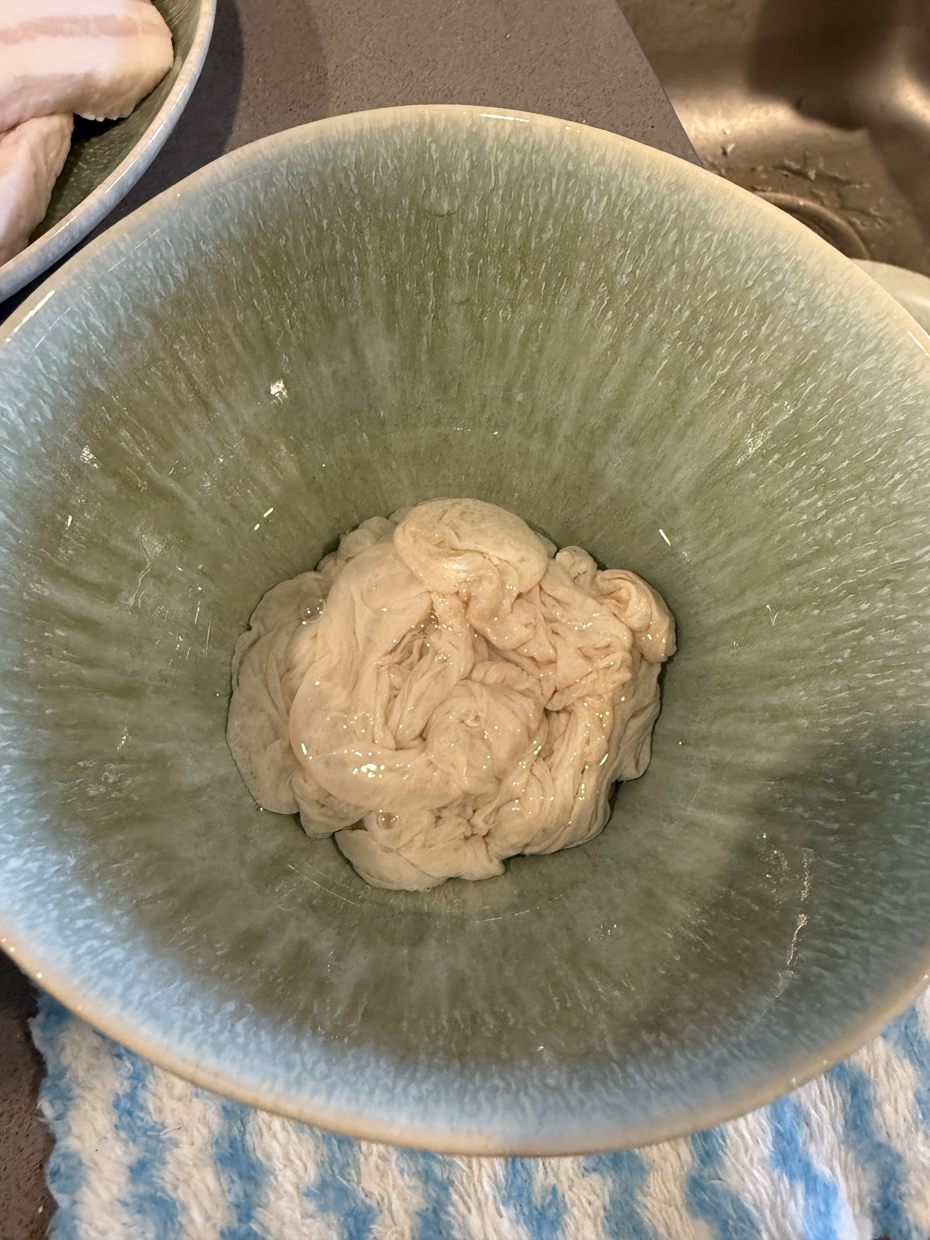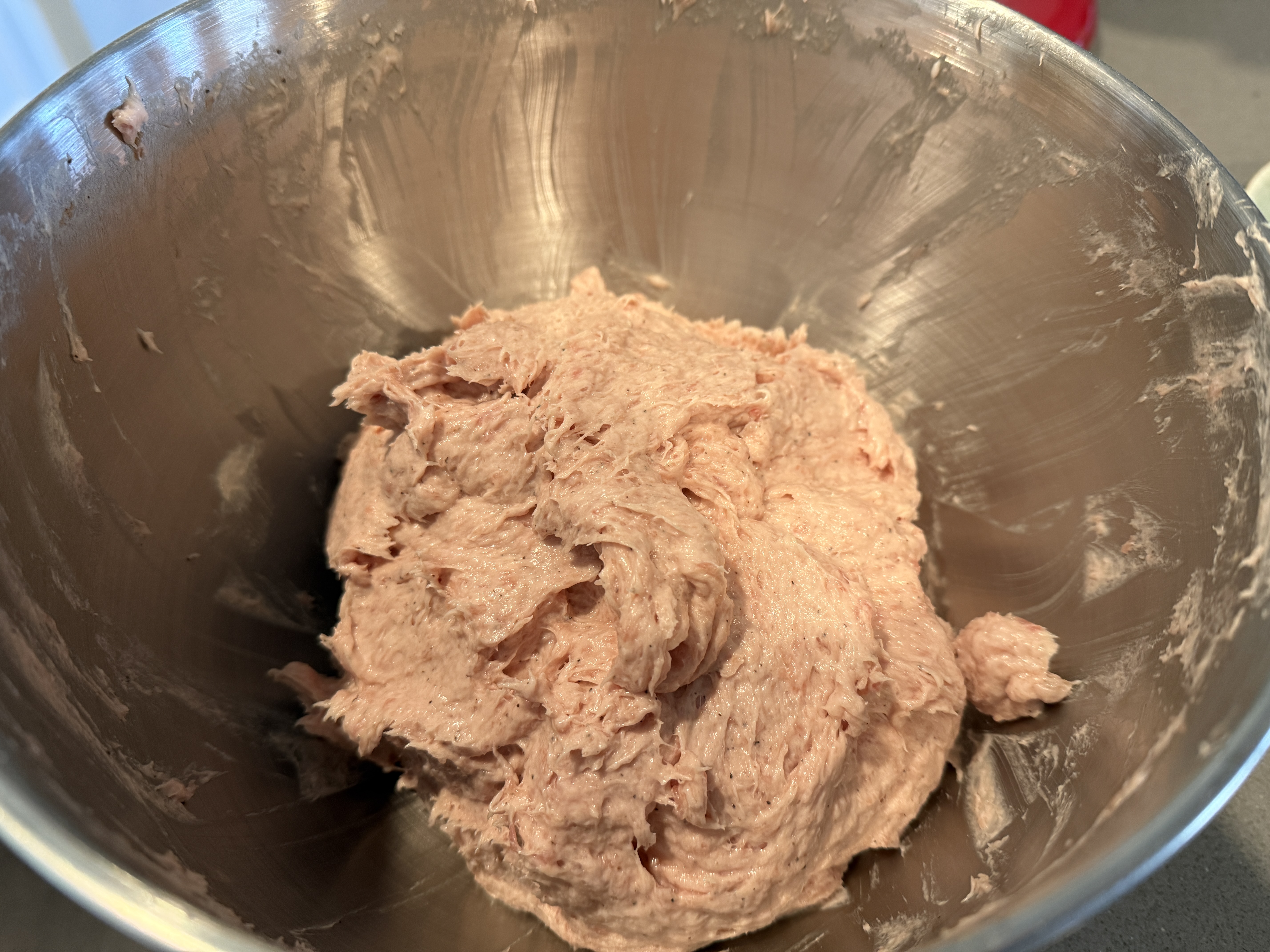肉馅搅打好之后是非常粘稠的 然后再盖上保鲜膜 放进冷藏(注意是冷藏不是冷冻)2小时, 这样肉馅可以出胶,脆皮肉肠就会更糯。