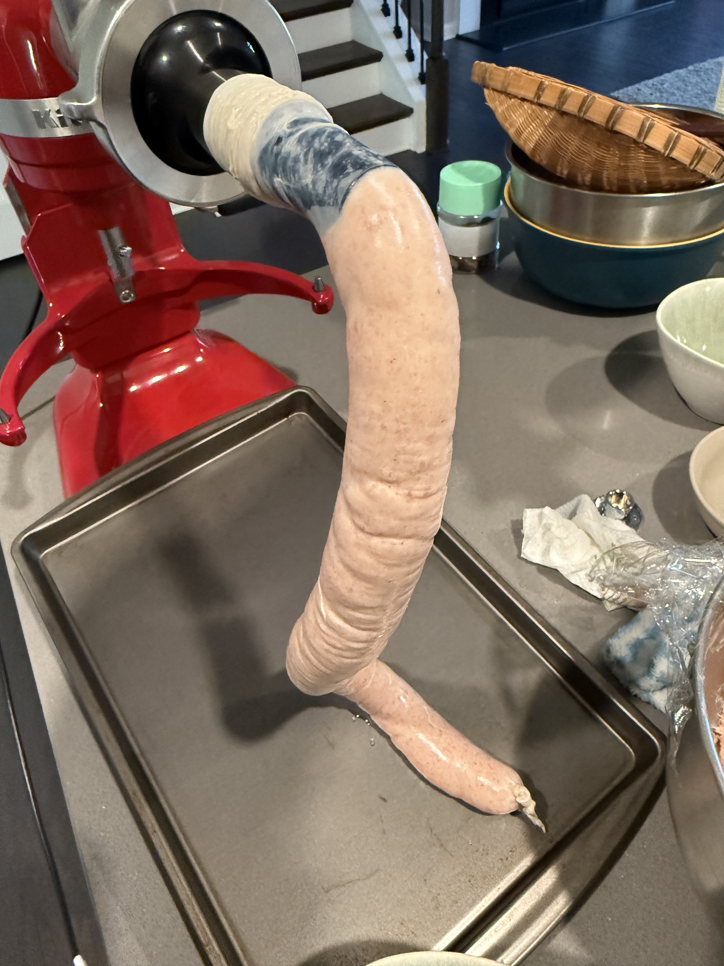 2小时后之后 拿出来 用灌肠配件 把肉馅灌进肠衣里。注意这一步厨师机的速度不要太快(我开的二档),这样好控制出肉速度,一个人坐可以得心应手。 当然你有p2帮忙的话 可以一个人灌 一个人整理。