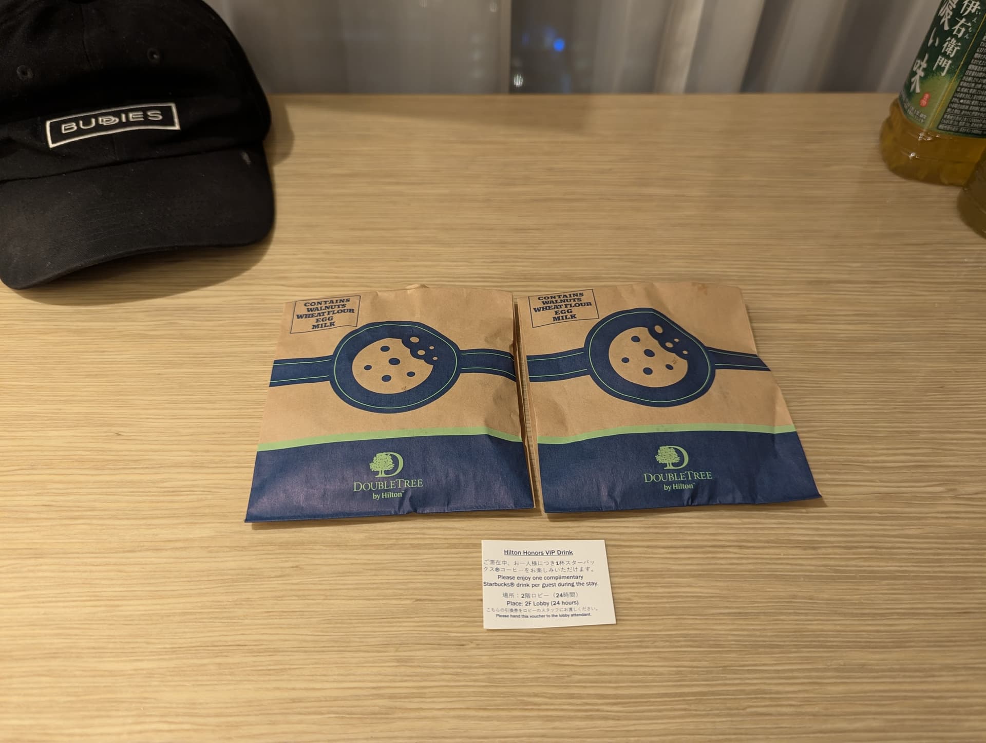 送了两块cookies也不知道算是开业福利还是水钻福利,像HH Shibuya那样的纪念品是没有的。还有一张很无语的星巴克咖啡券说是可以到lobby换,但lobby并没有星巴克的店,只有几台自助咖啡机但居然还不让你免费用,十分离谱 ![]()