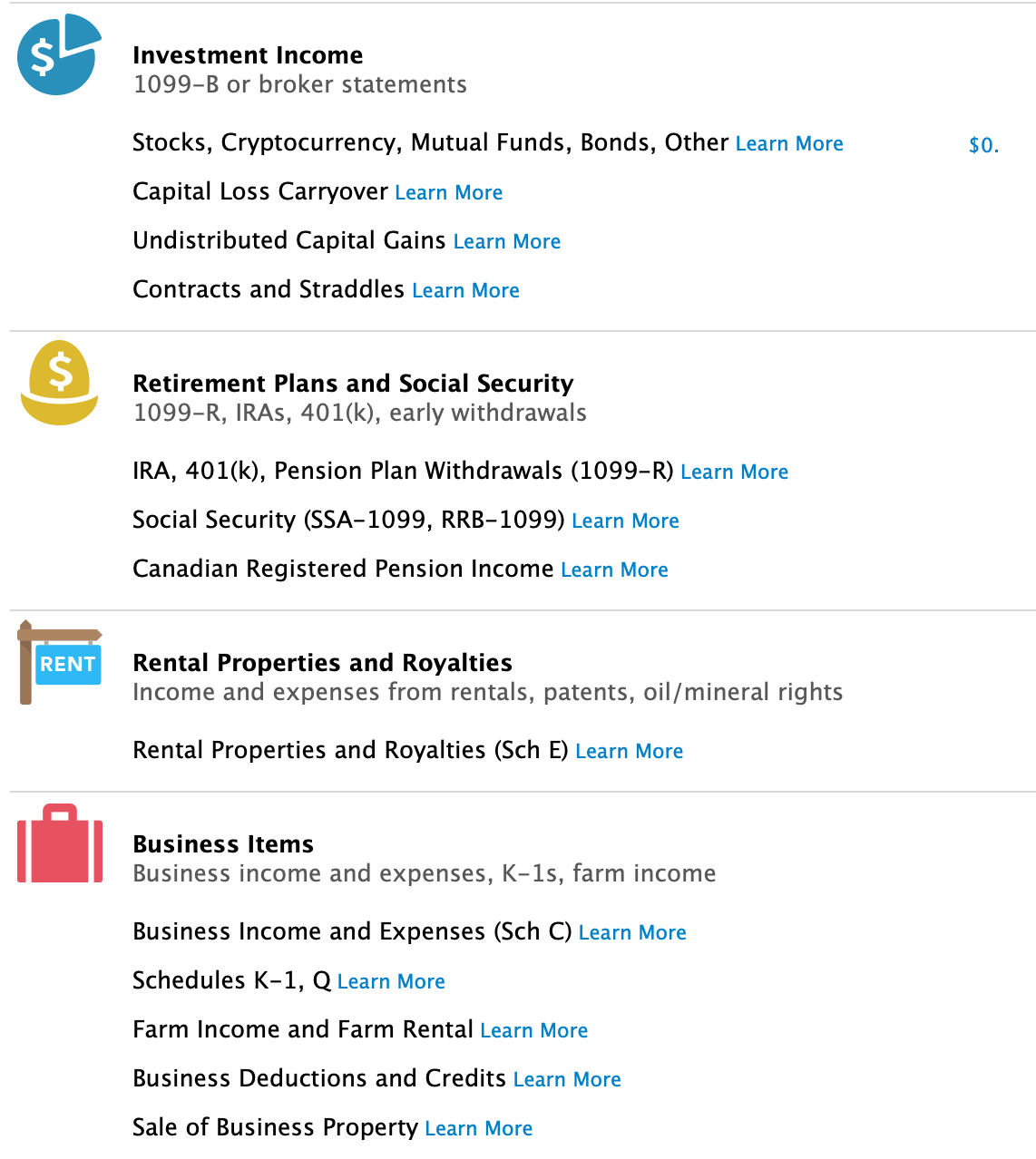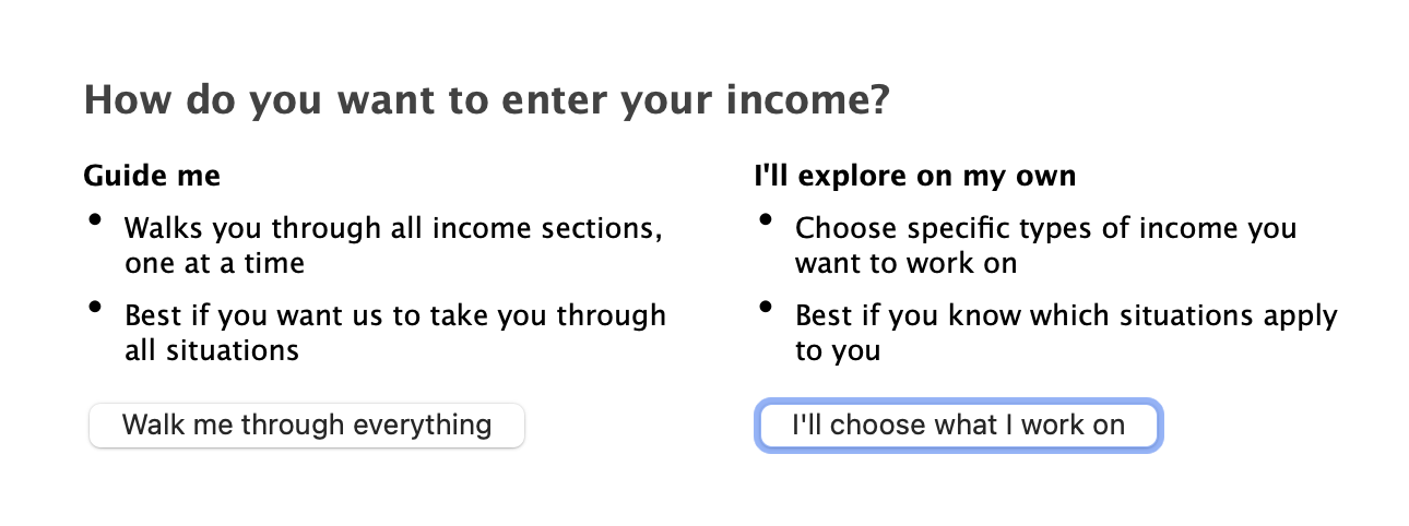 所以 Desktop 版本之间的区别主要是:interview questions 不一样。针对以下不一样的情况,turbotax 会给不一样的 interview questions,也就是说,要是点右边的框 (“I’ll choose wha I work on”),各个版本是没区别的。