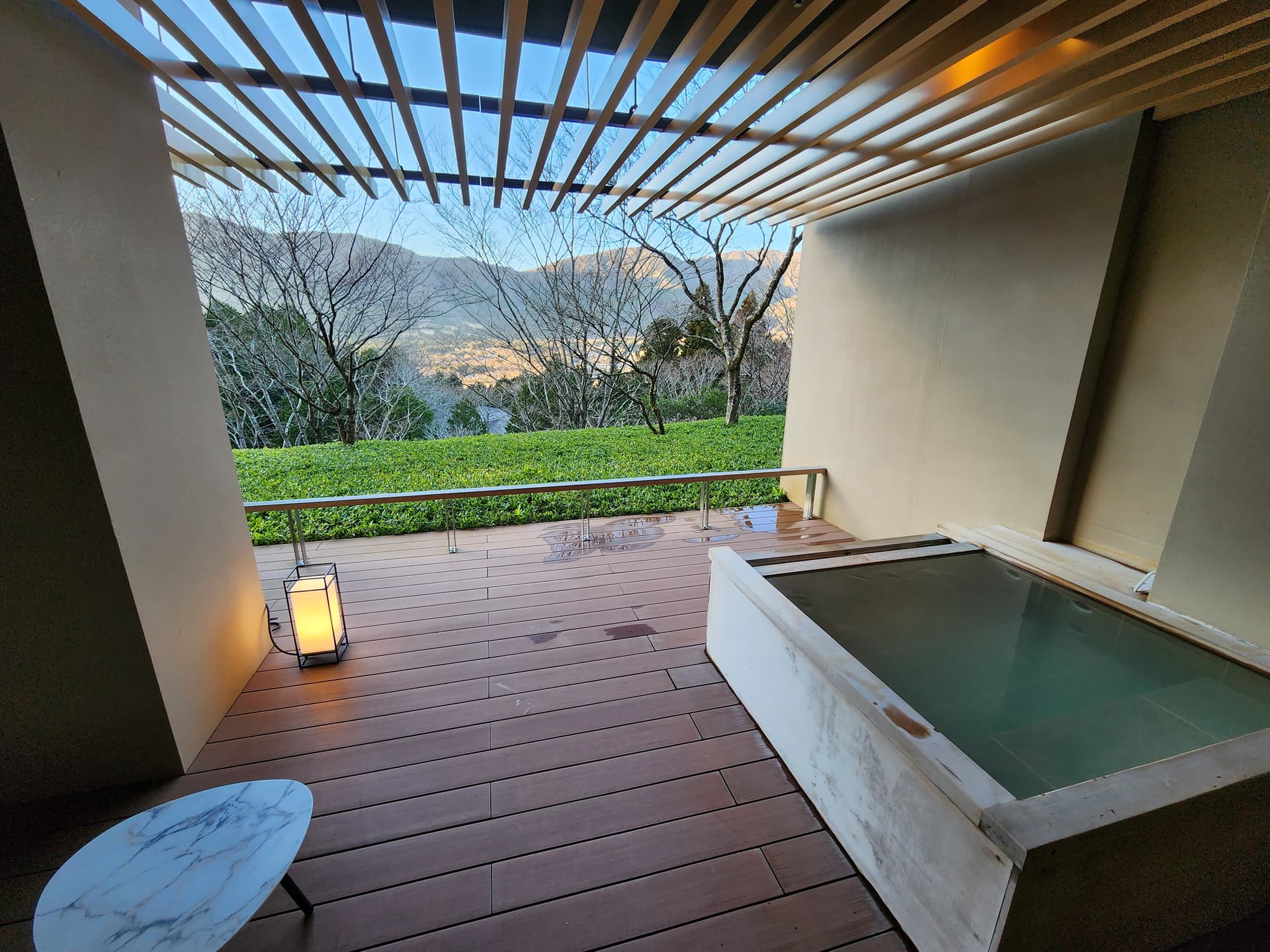 房间室外阳台也有温泉池。阳台的温泉池好像是24小时循环的,有门直通房间的淋浴间。虽然就一两步路但是冬天还是有滑倒的风险。冬天去挺冷的,会有风,泡起来体验一般