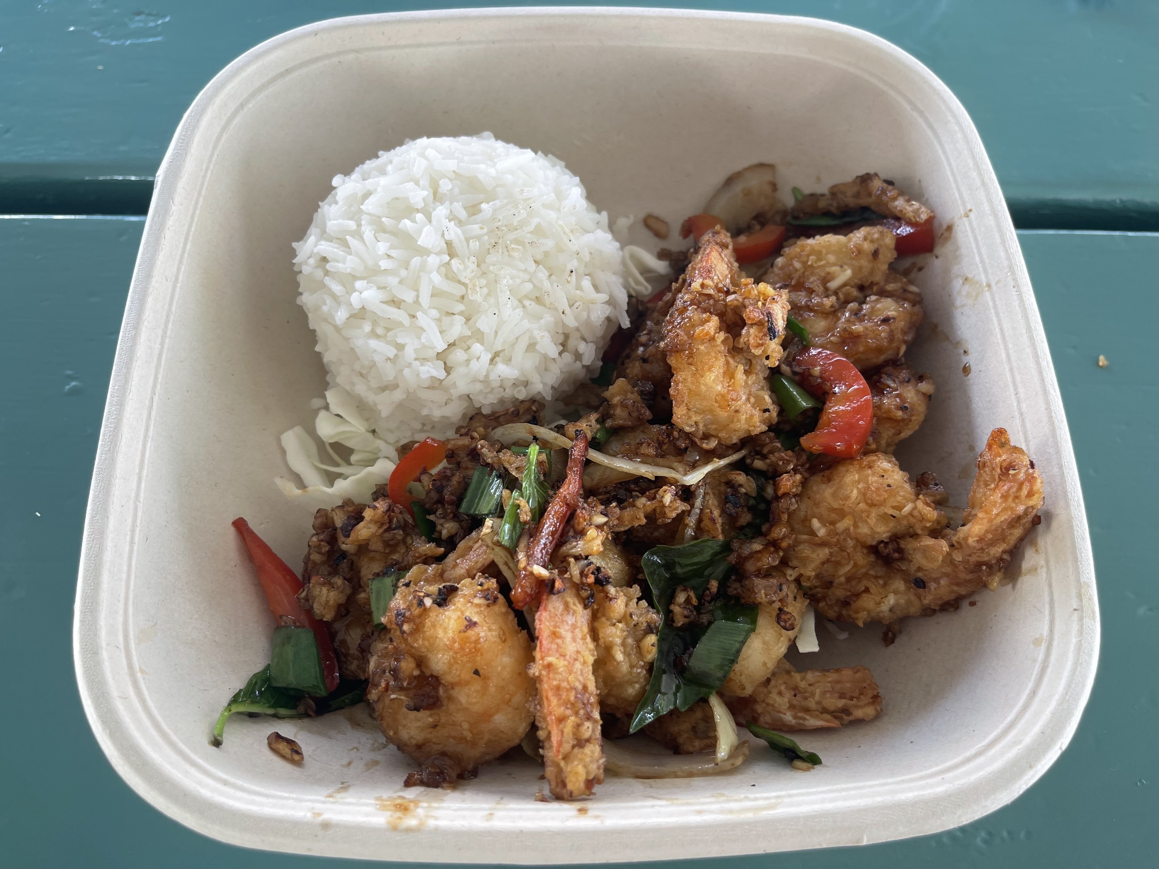 老网红餐车2号,就是不是很想吃炒饭炒粉就是了他家Garlic Shirmp(我知道隔壁 Geste Shrimp Truck的虾饭也不错),意外的很好吃,虾炸的很不错,蒜味很足