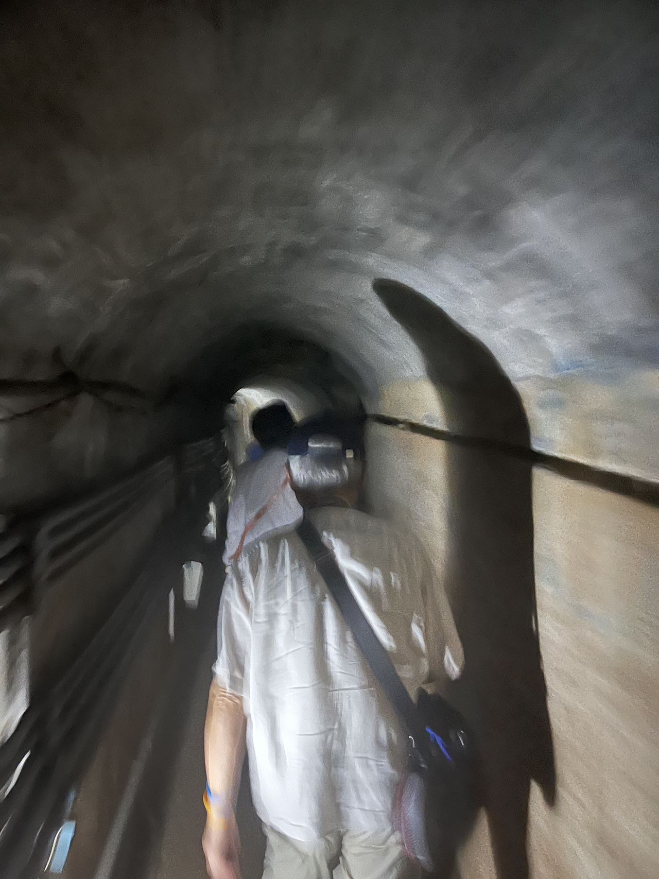 第二站某坑道(對不起名字我真忘了,金門有好幾個坑道,都是真實使用過並且未來也許會使用的戰時通道)通道裡其實很暗只有一小段亮著。要走很久。