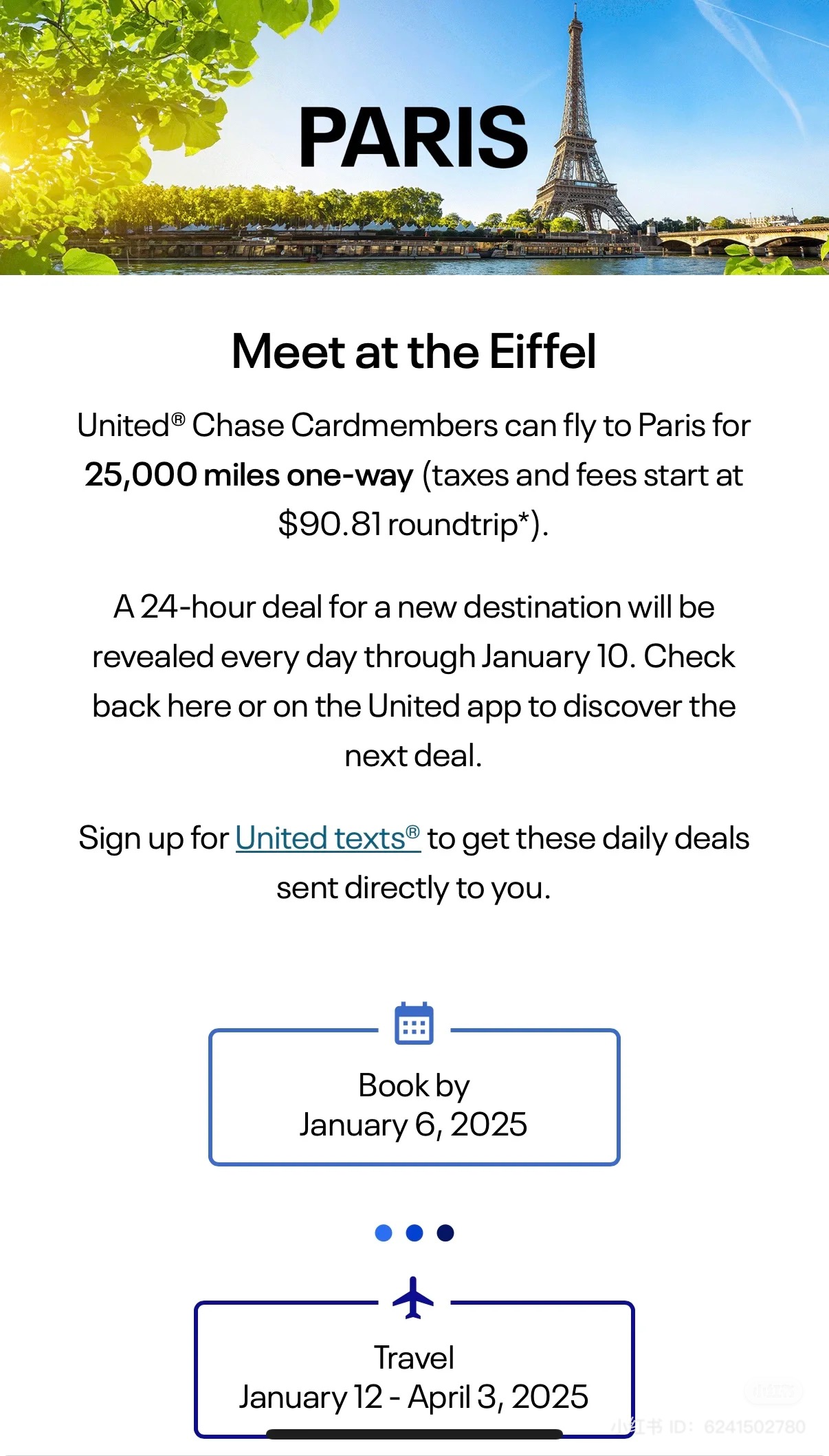 United has new deals 1/6: Paris, 25K Miles one way to/from Paris, Travel 1/12-4/3 1/7: Amsterdam 1/8: Frankfurt 1/9: Munich 1/10: London
