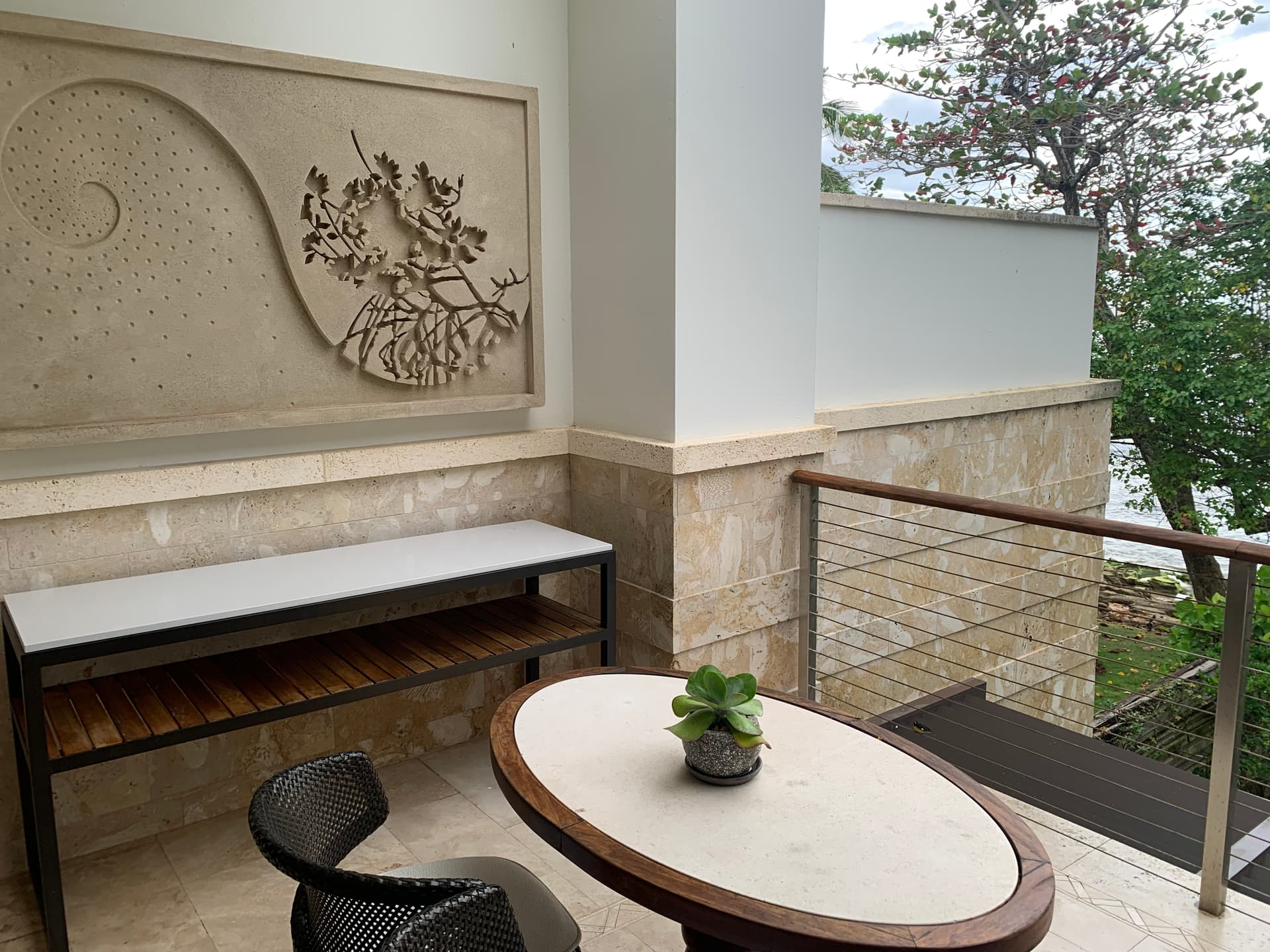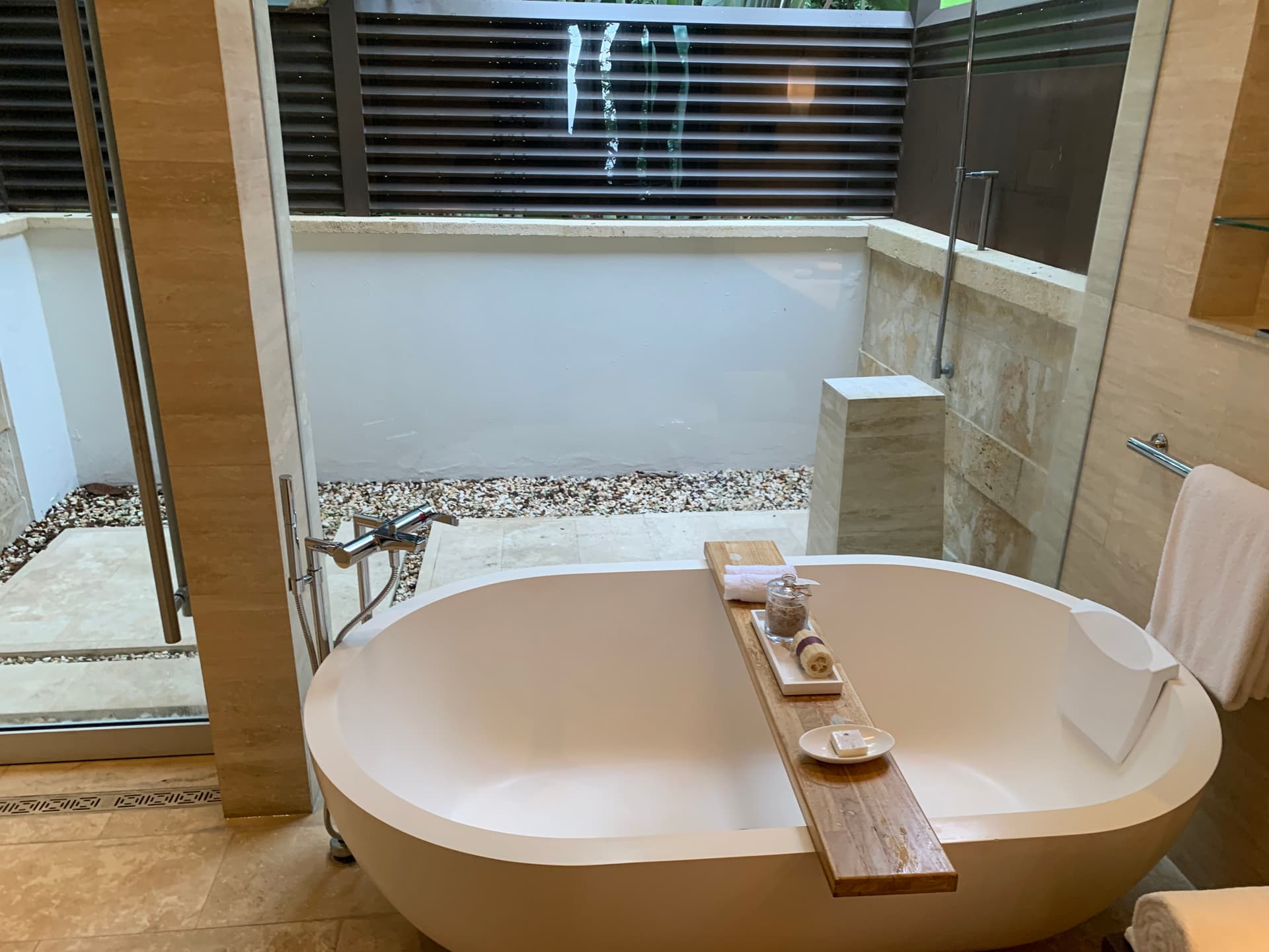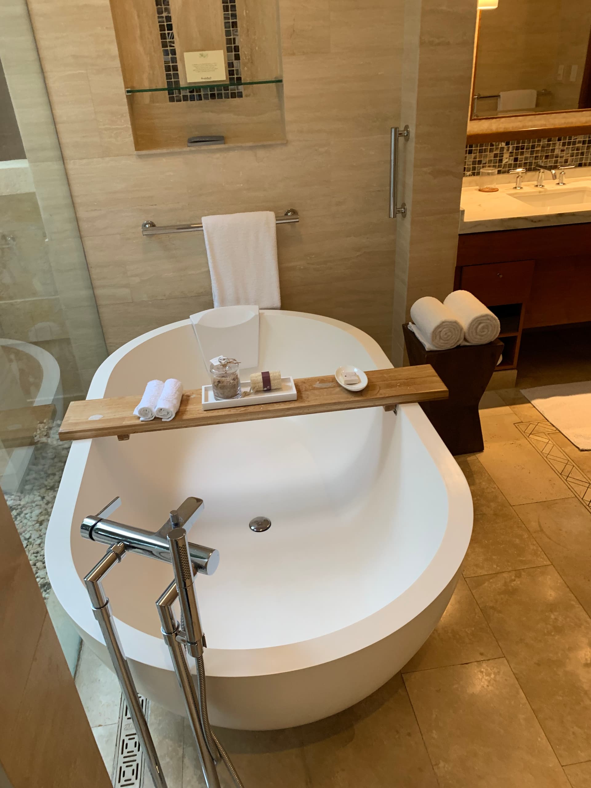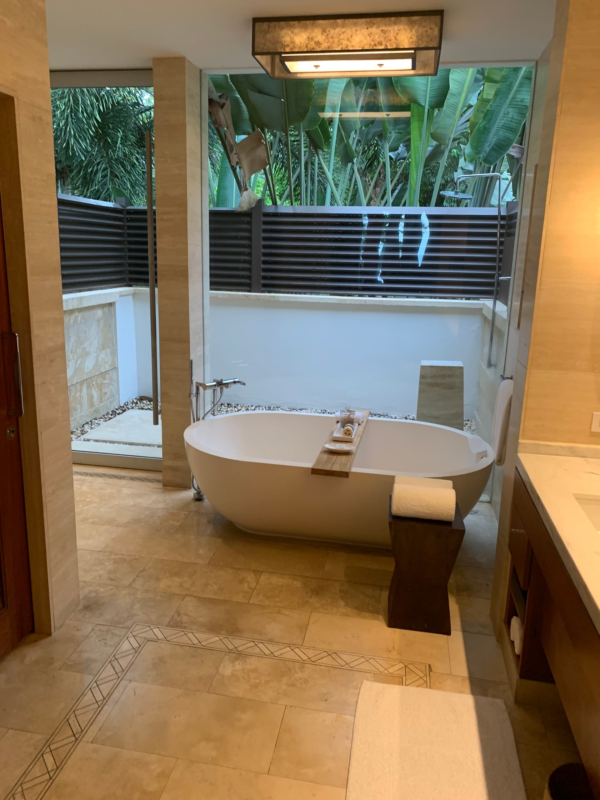 这房间我个人感觉是真心不错的,快1000sqft的面积,卫生间的室外淋浴真的特别有设计感,(虽然12月但温度还是30摄氏度所以真洗澡就有点闷热)。浴缸也特别大。所有备品都是他们spa自己研制的ginger lemon味道系列的,闻着很清新。阳台的海景其实真的还不错,就是照片里实在体现不出来哈哈哈。真心很完美。