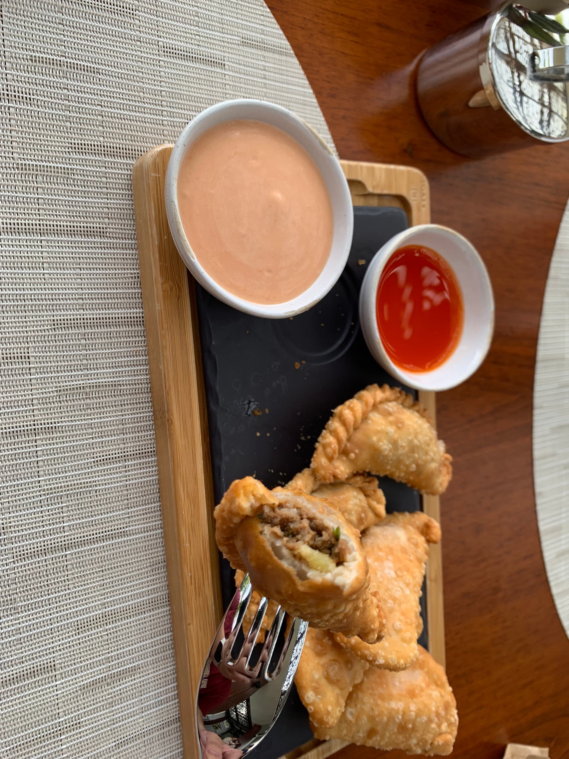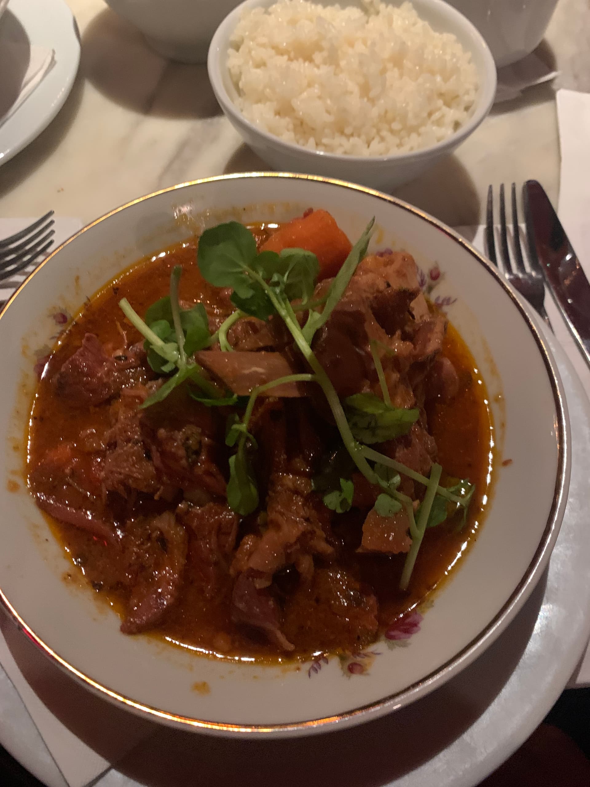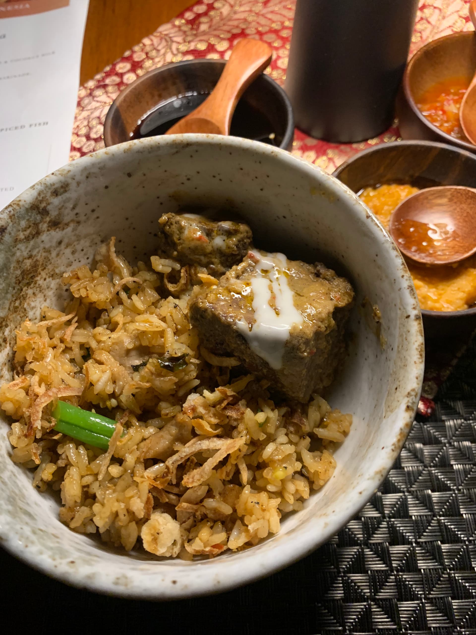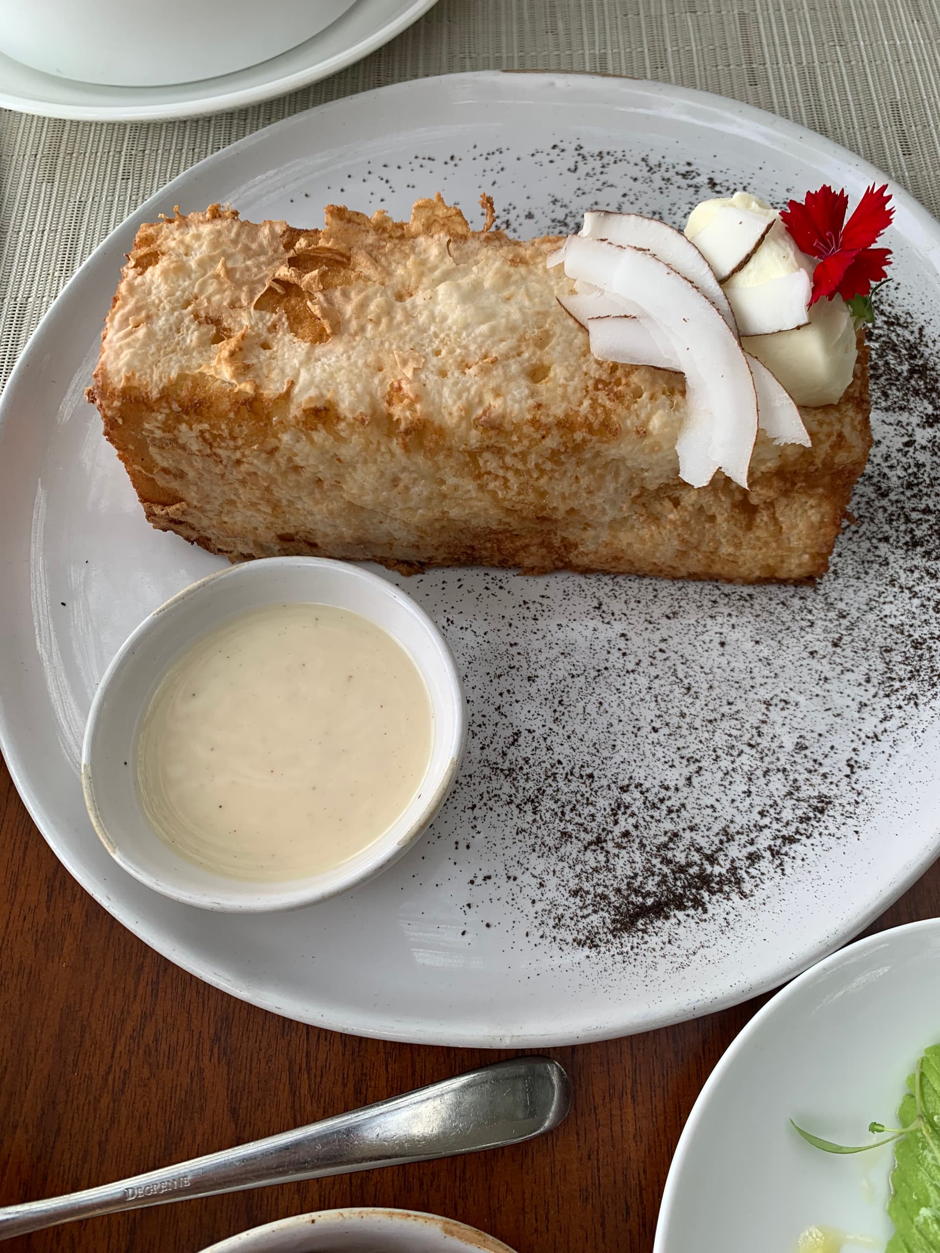 酒店好像有三四个餐厅,当天正好有个special event,印度尼西亚buffet,管家说2人位就只剩最后1个slot,我们寻思那就去看看怎么个事。结果觉得还真的挺好吃。前菜会一盘盘端上来,主菜有炖牛肉,鸡肉炒饭,各种烤串,羊肉汤什么的,主菜都有厨子站在旁边现场做,还有各种甜点。主菜和甜点都是自取。真的特别符合我的胃口哈哈哈,感觉应该搬到常驻菜单。有个类似“椰子西米露”的甜点属实惊艳。