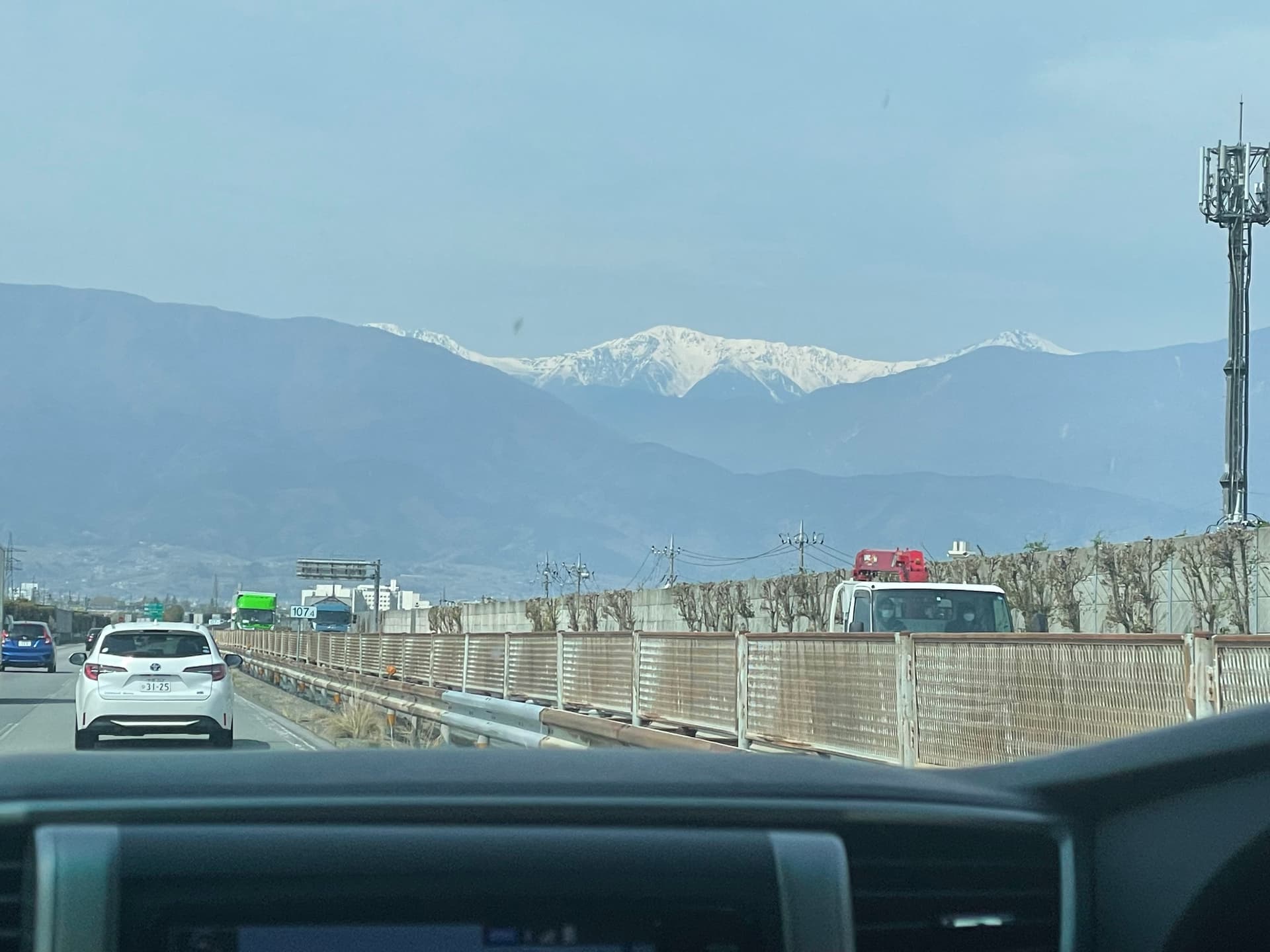 进过八王子-大月市-10:30翻过了山脉到了开阔点的山梨县, 甲府市,第一次看到日本阿尔卑斯/中部山脉。