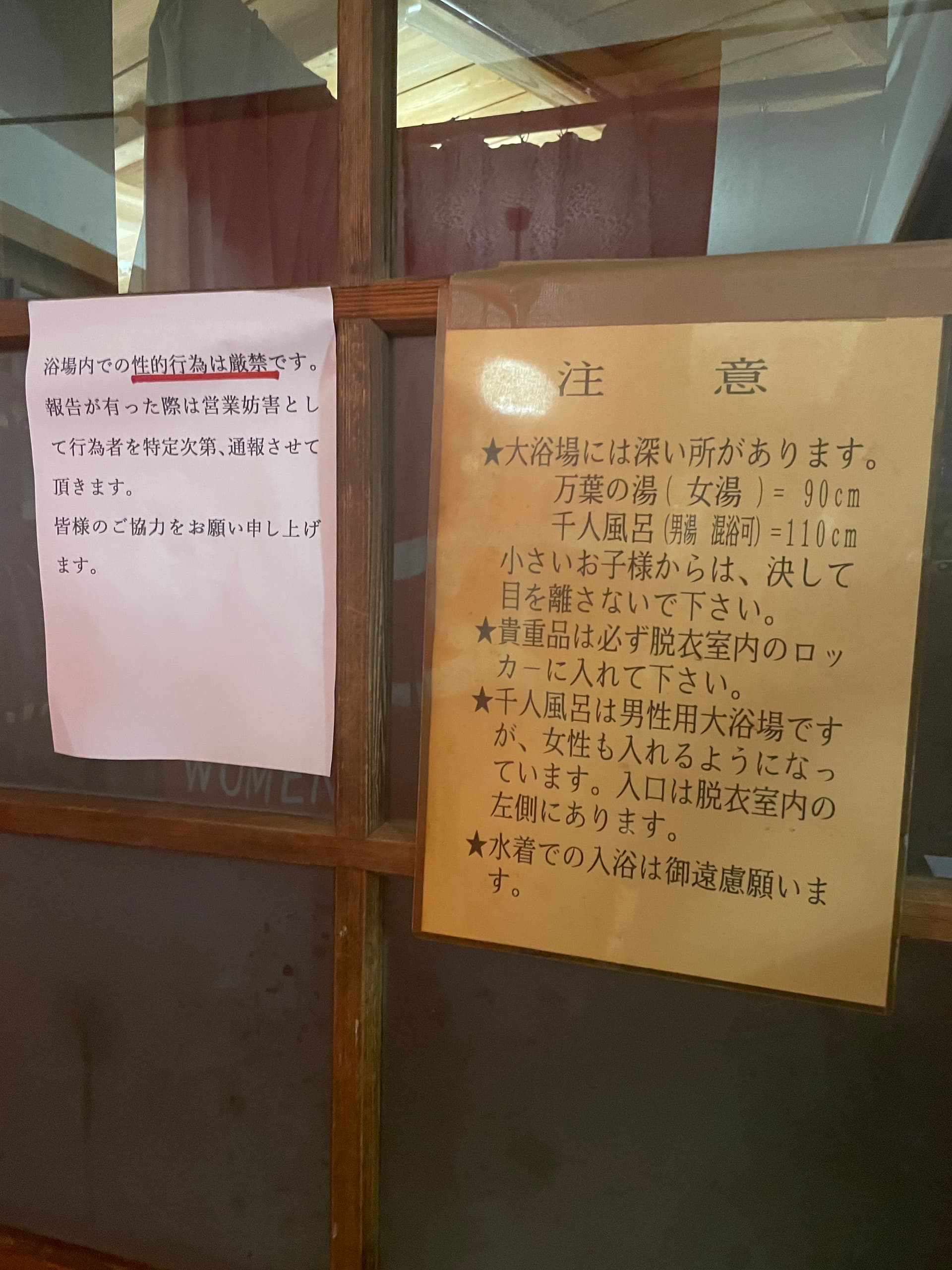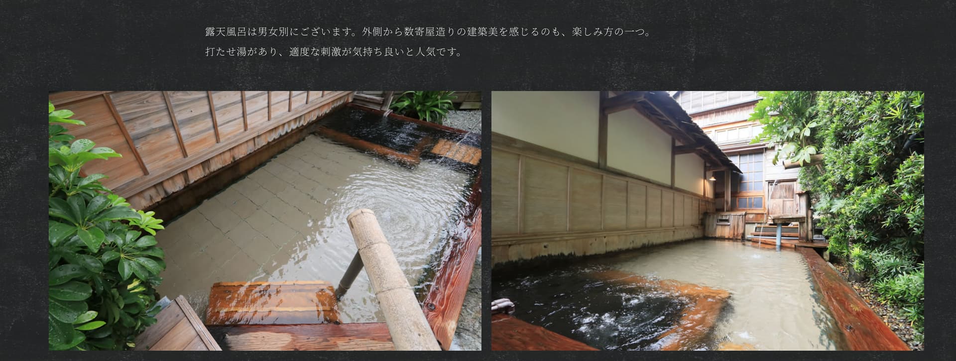 因为古老,所以浴场非常古典,全木式没有瓷砖。是日本最大的木制女浴场,建筑的半圆形结构很独特。大型公共浴室是由当地建筑工匠以可靠的技术完成的。和千人楼一样,这里也是一个可以感受木头的温暖、舒缓身心、体验日本文化的地方。