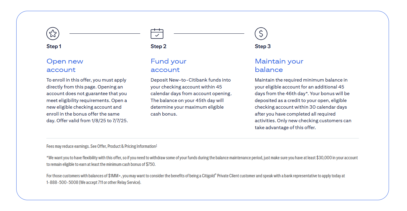 “Offer Period is on and between January 7, 2025 – March 31, 2025. During the Offer Period, New Citi Savings accounts opened online or in a physical branch will receive the Promotional Interest Rate of 4.35% if they fulfill the Required Activities. The Minimum Balance to earn APY and the Promotional Interest Rate during the Promotional Rate Period is $25,000.”