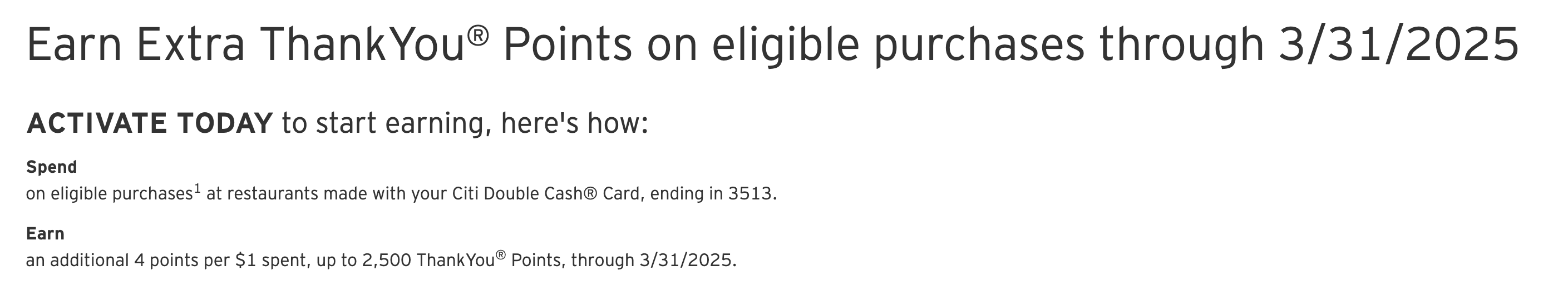 This offer starts upon enrollment and will end on 3/31/2025. Earnings associated with this program will equal 4 bonus ThankYou® Point(s) per $1 spent on eligible purchases and may overlap with other special offers in which you are currently enrolled. Bonus points awarded with this offer are subject to a maximum of 2,500 additional points.