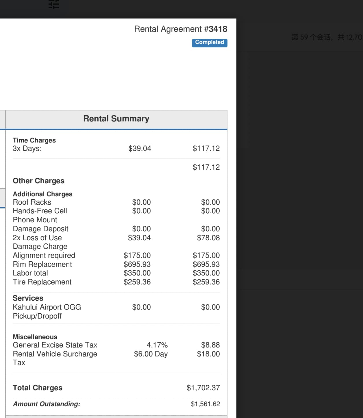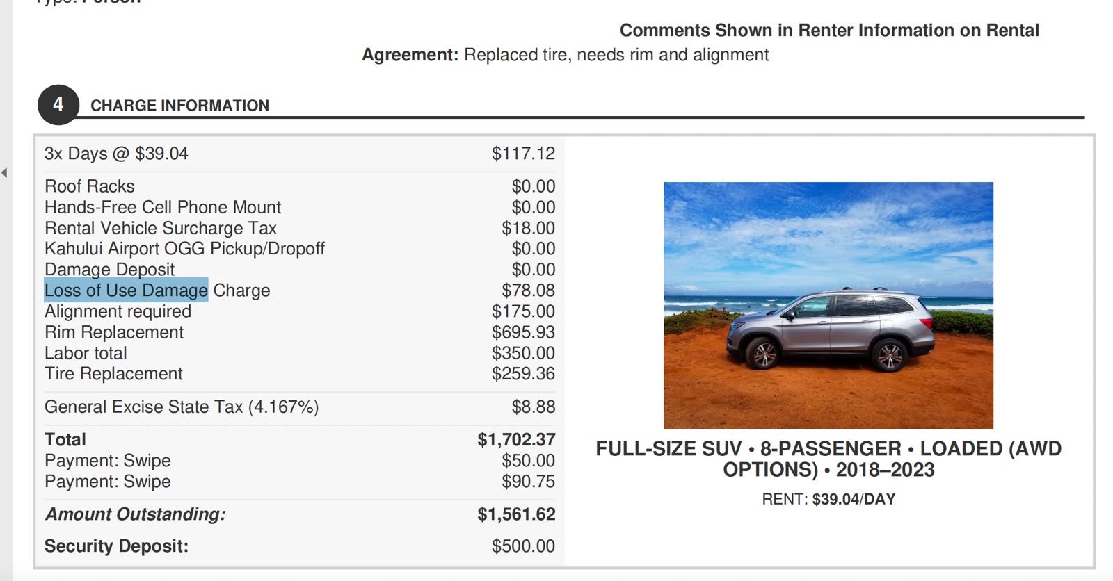 Day 0晚上提车,Day 1白天疑似Haleakala山路岩壁落石滚到车下引发爆胎,我们换好备胎开回车行,车行拒绝免费更换新车给我们,除非我们另外租一辆,于是我们等车行去Costco换了轮胎后拿回了事故车继续旅行。