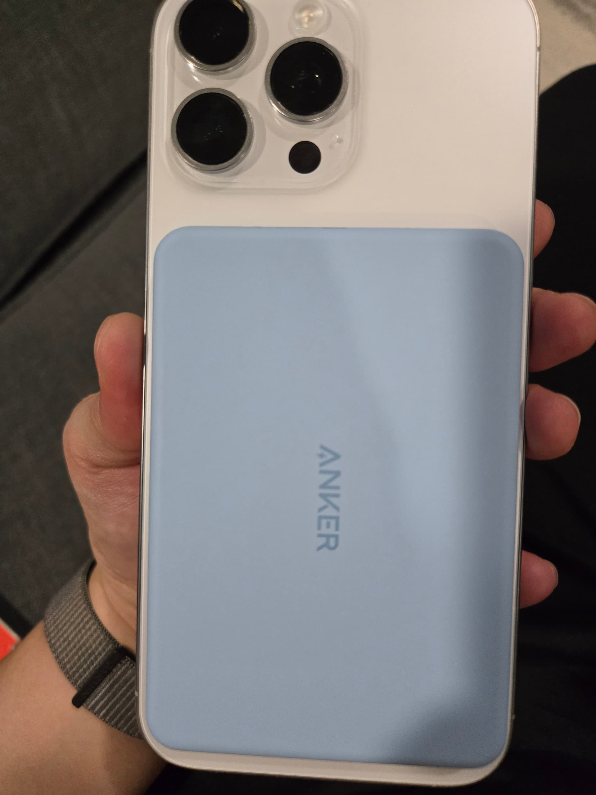 我出门旅游都是贴着这种磁吸逛街的,虽然充电慢,但是不用连线,不影响拍照。一个山寨10k毫安的充电宝加上手机本身的电也够顶一天了。但是$50是真下不去手。