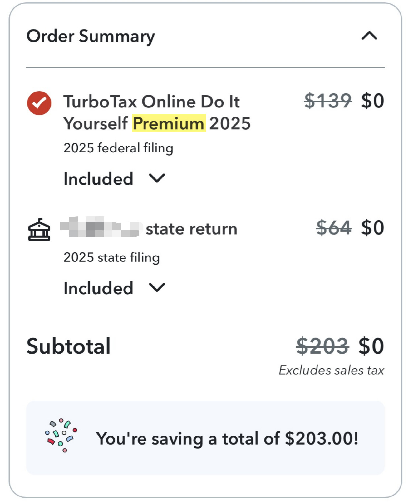 - 之后去Finish & File里checkout锁单,结账界面确认是Premium version,点confirm payment,成功锁单会收到order confirmation的邮件,state没available可以先锁federal,state可以之后单独加上,但记得要在02/28/2026之前再checkout一次