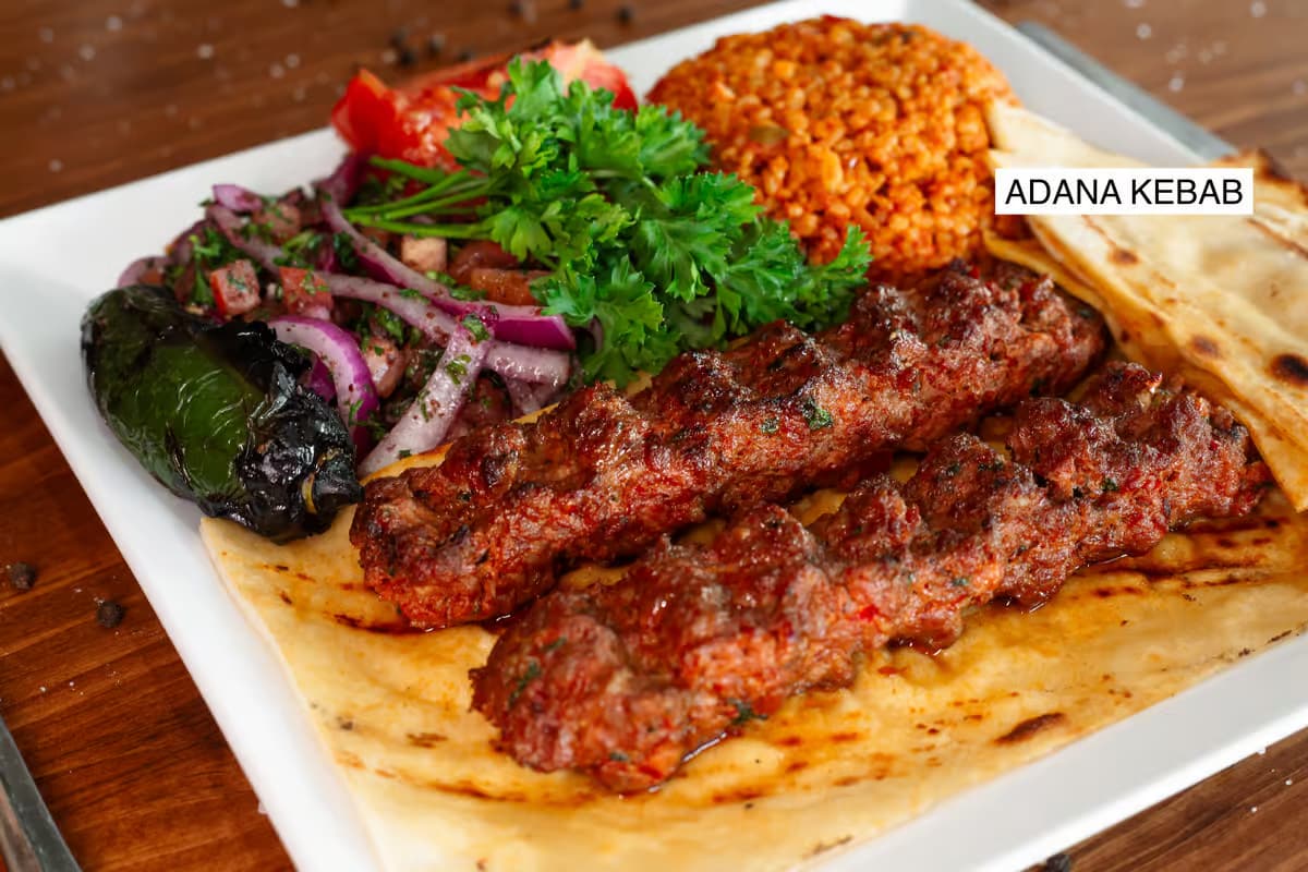土耳其非常出名的主菜 Adana kebab,这道菜关键是碎肉串。土耳其人相对阿拉伯/伊朗人比较少吃饭,他们喜欢吃饼,所以很多 kebab 上菜都是在肉下边垫一层饼。然后旁边放洋葱、辣椒等。
