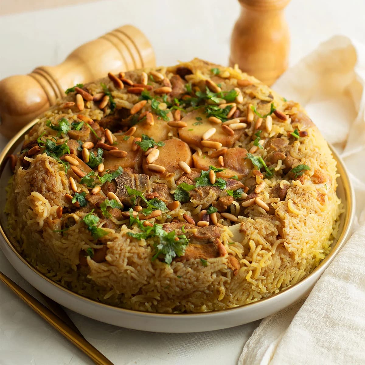 约旦/巴勒斯坦国菜 Maqluba مَقْلُوبَة 意为上下颠倒;做法讲究的是米饭、肉、配料叠在一起的分层感