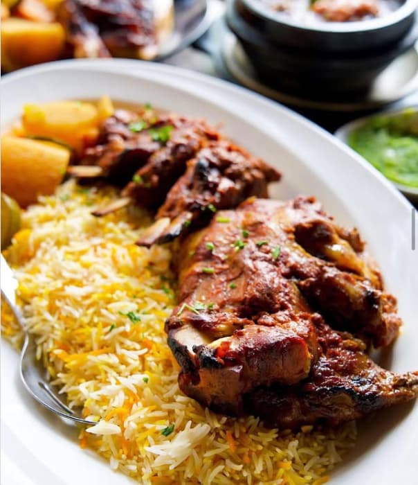 沙特国菜 Kabsa كبسة 菜名意为“压扁”,意思是把米饭、肉、香料、配料全部挤压在一起做。先在锅里炖鸡肉/羊肉,然后把生米放到锅里跟肉汁一起炖,这样肉的香味就收缩在饭里,吃起来