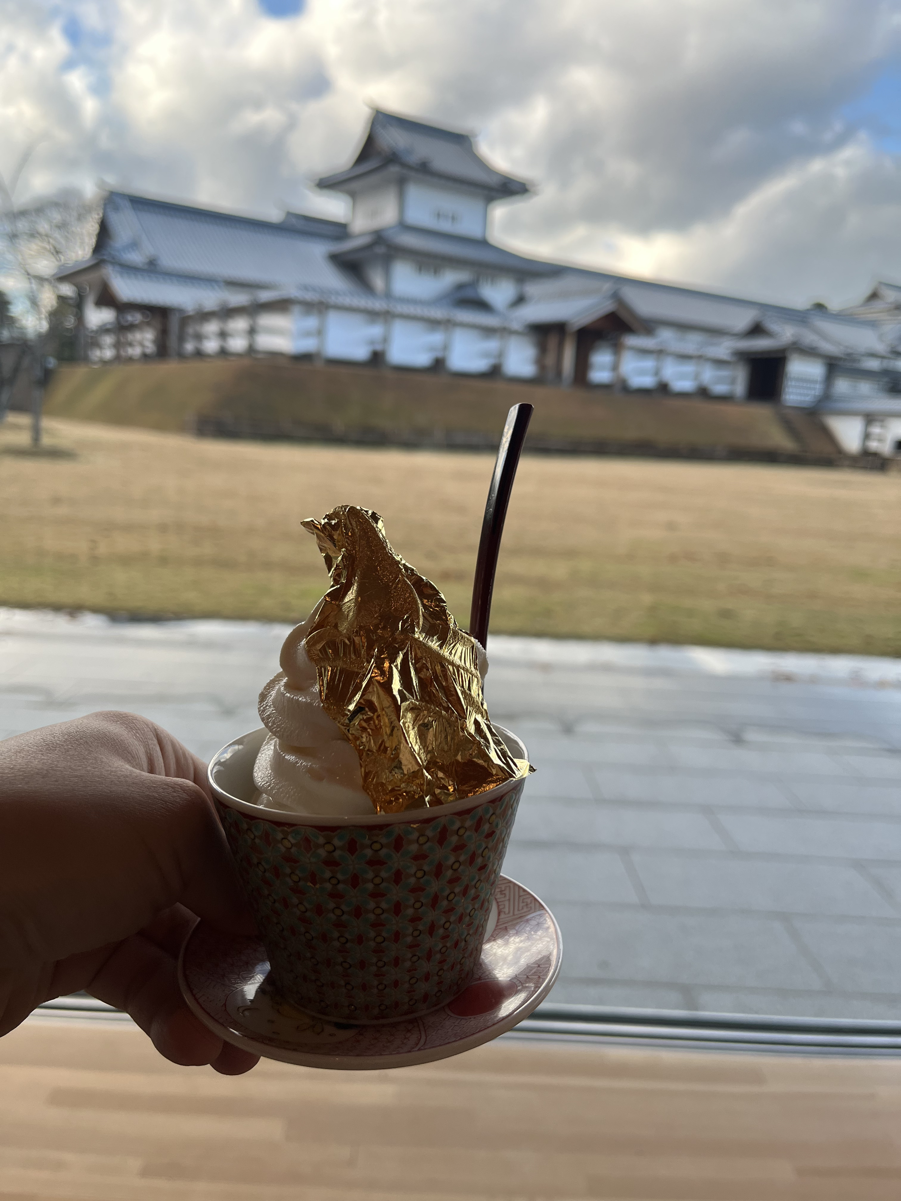 从兼六园出来可以直奔旁边的金泽城公园。有个沿途有个休息室可以吃到金箔冰淇淋