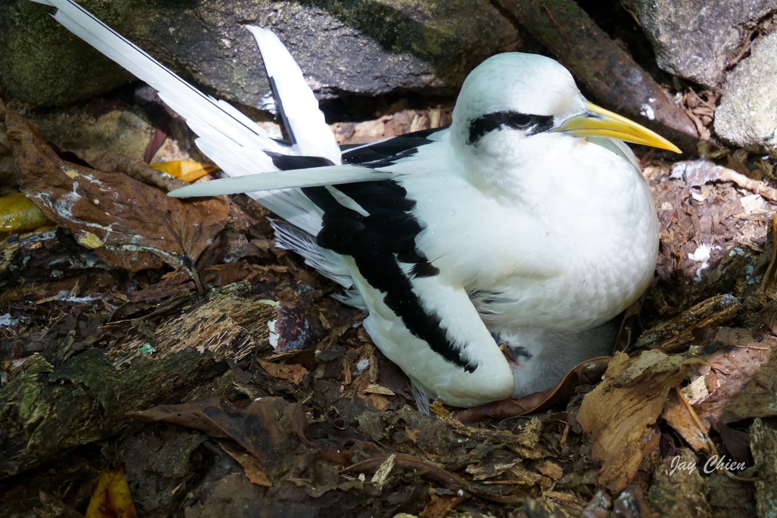 白尾熱帶鳥, 直接在地上築巢, 完全不怕人. 注意幼鳥就在成鳥身體下.
