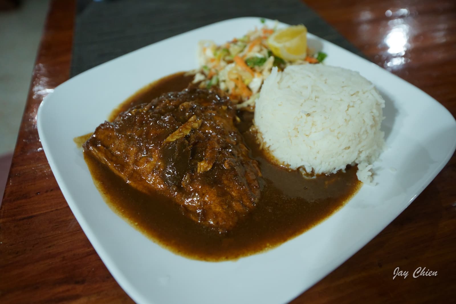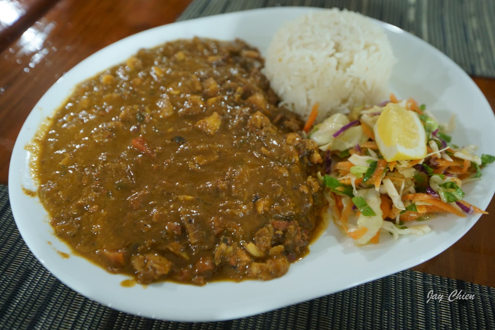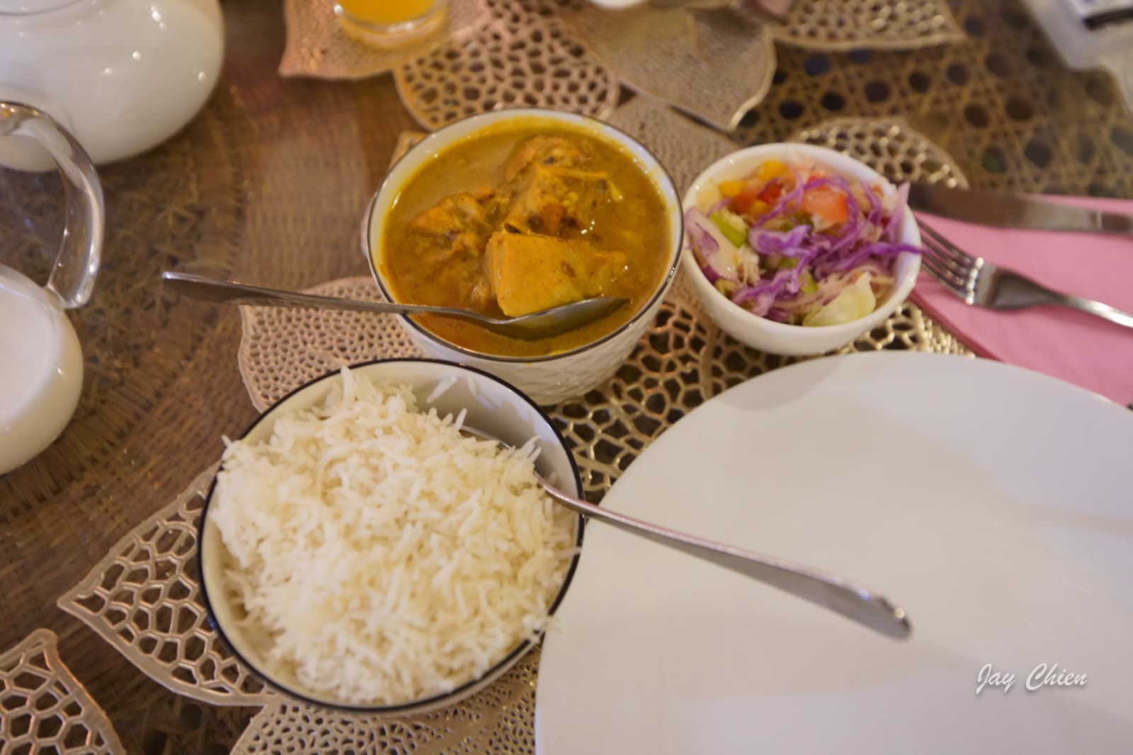 典型的塞席爾美食, 魚肉/肉類咖哩, 配上米飯.