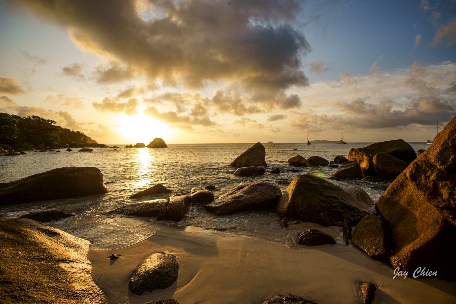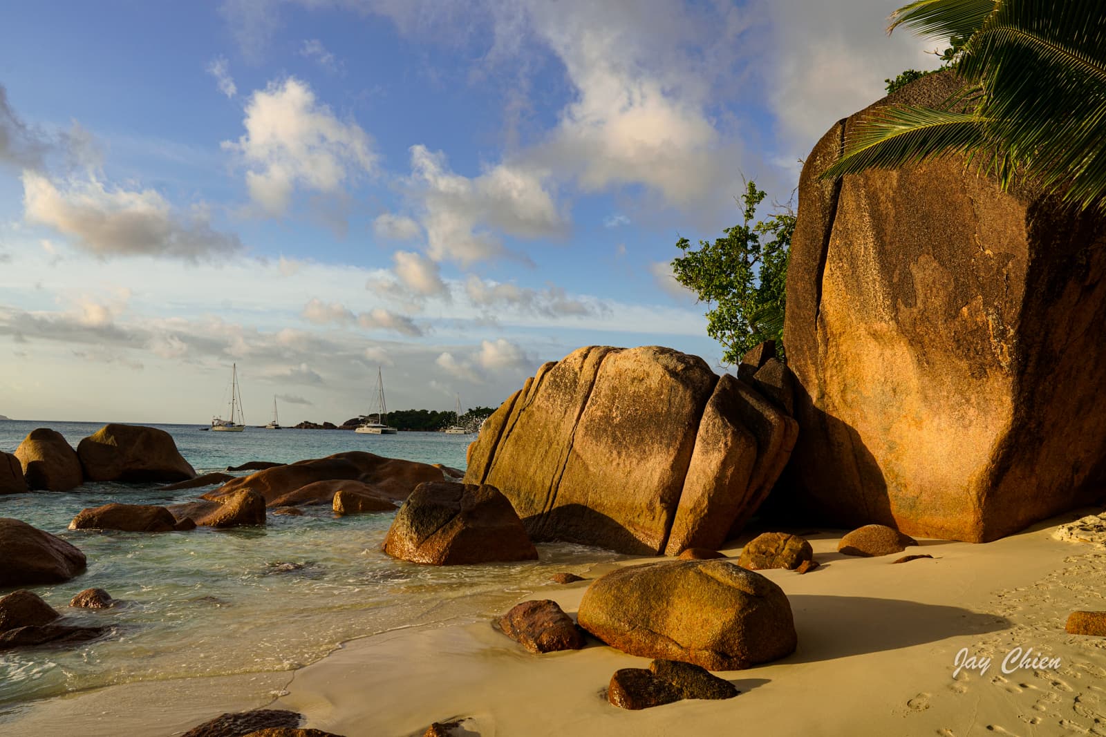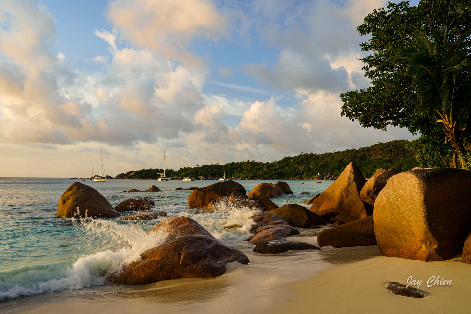 Anse Lazio海灘, 普拉蘭島上最美海灘, 巨大花崗岩散落攤上, 日落時分, 遊船三三兩兩