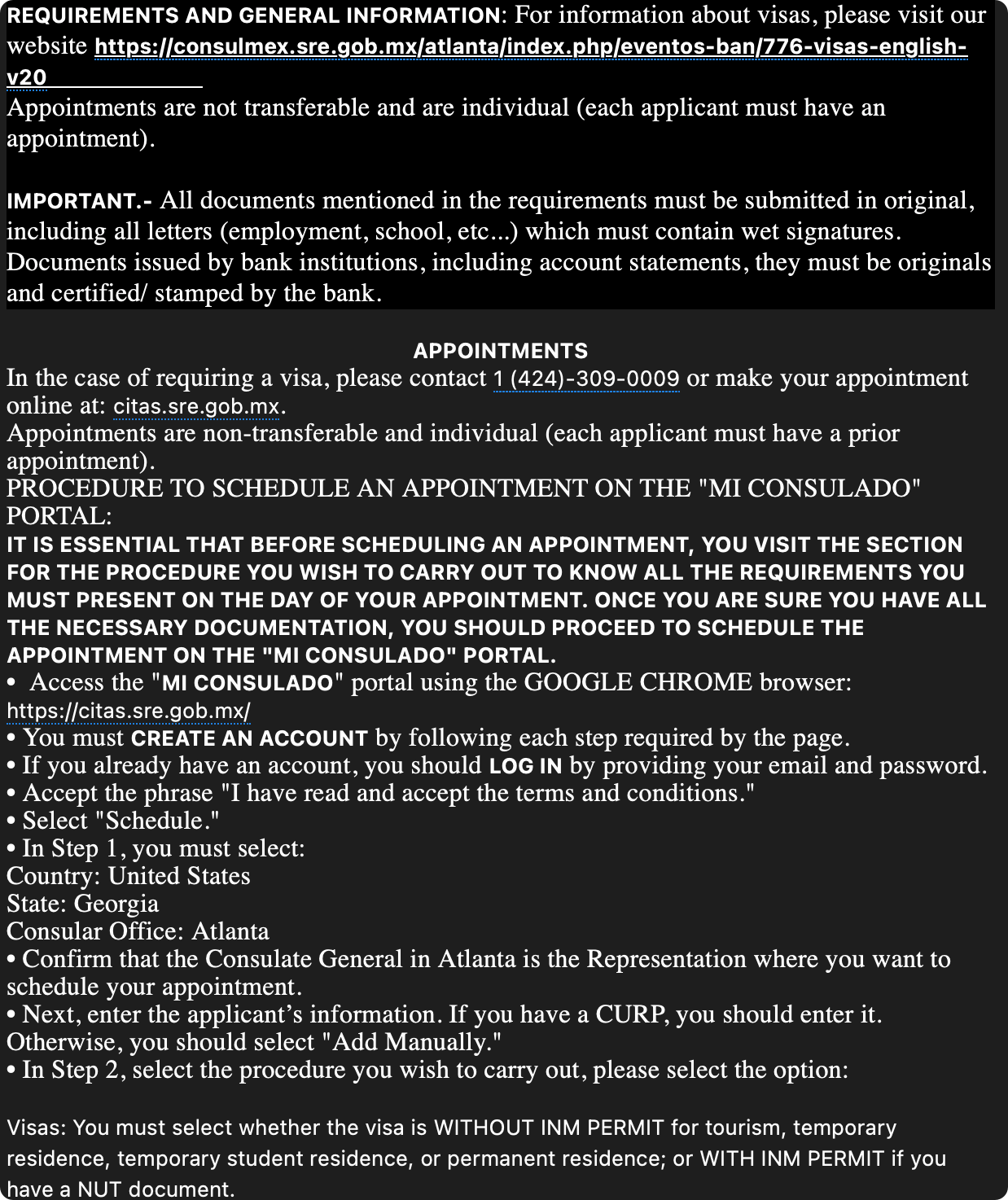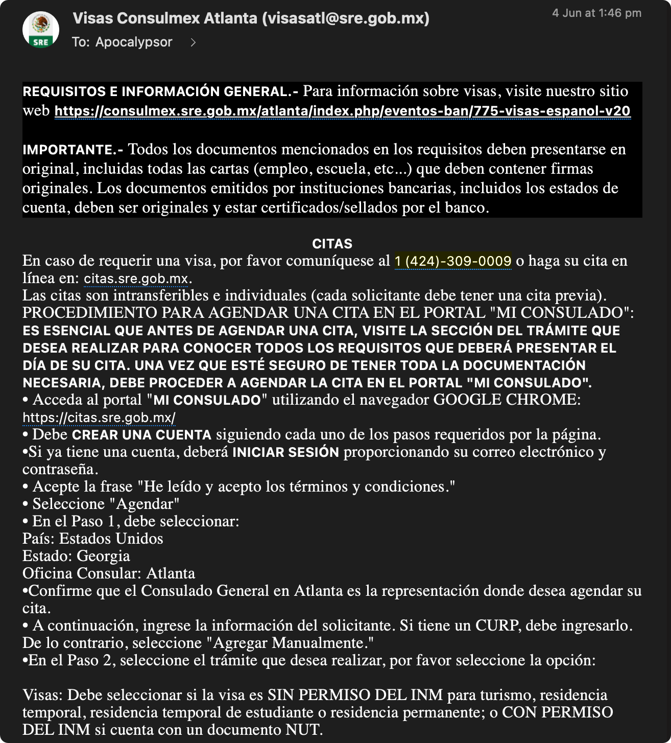 For visa application request at the General Consulate of Mexico in Atlanta, we attend only and exclusively by appointment. You must request your appointment only by email [email protected] Appointments are not made by phone.