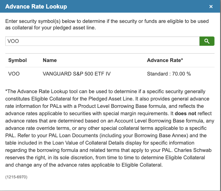 如果你点进PAL的网页往下拉,会发现一个入口叫Advanced Rate Lookup,可以通过这个来提前看一下自己的各项资产能借多少钱,之前的帖子里因为我的建议是all in VOO,就用的VOO的百分比70%