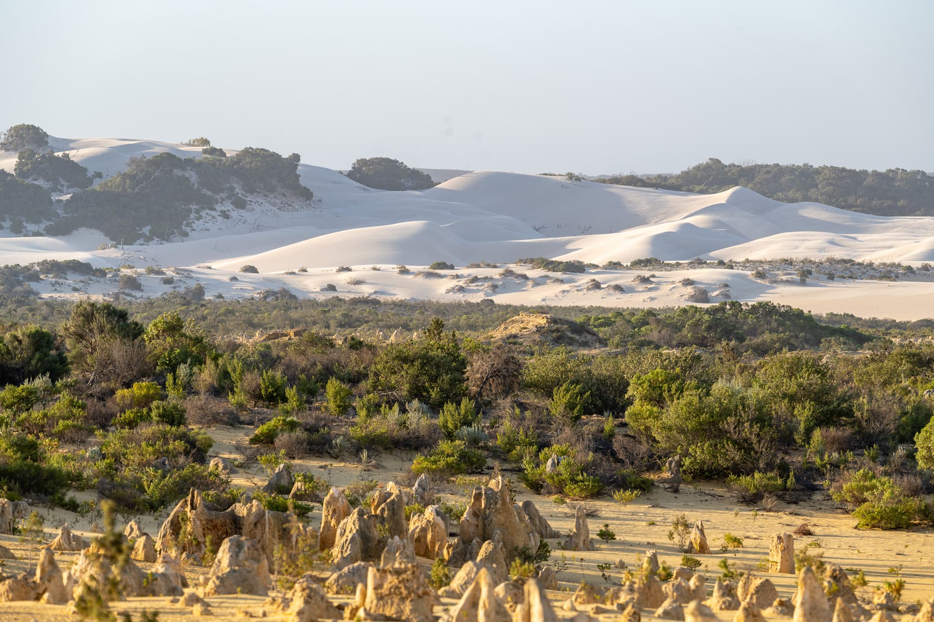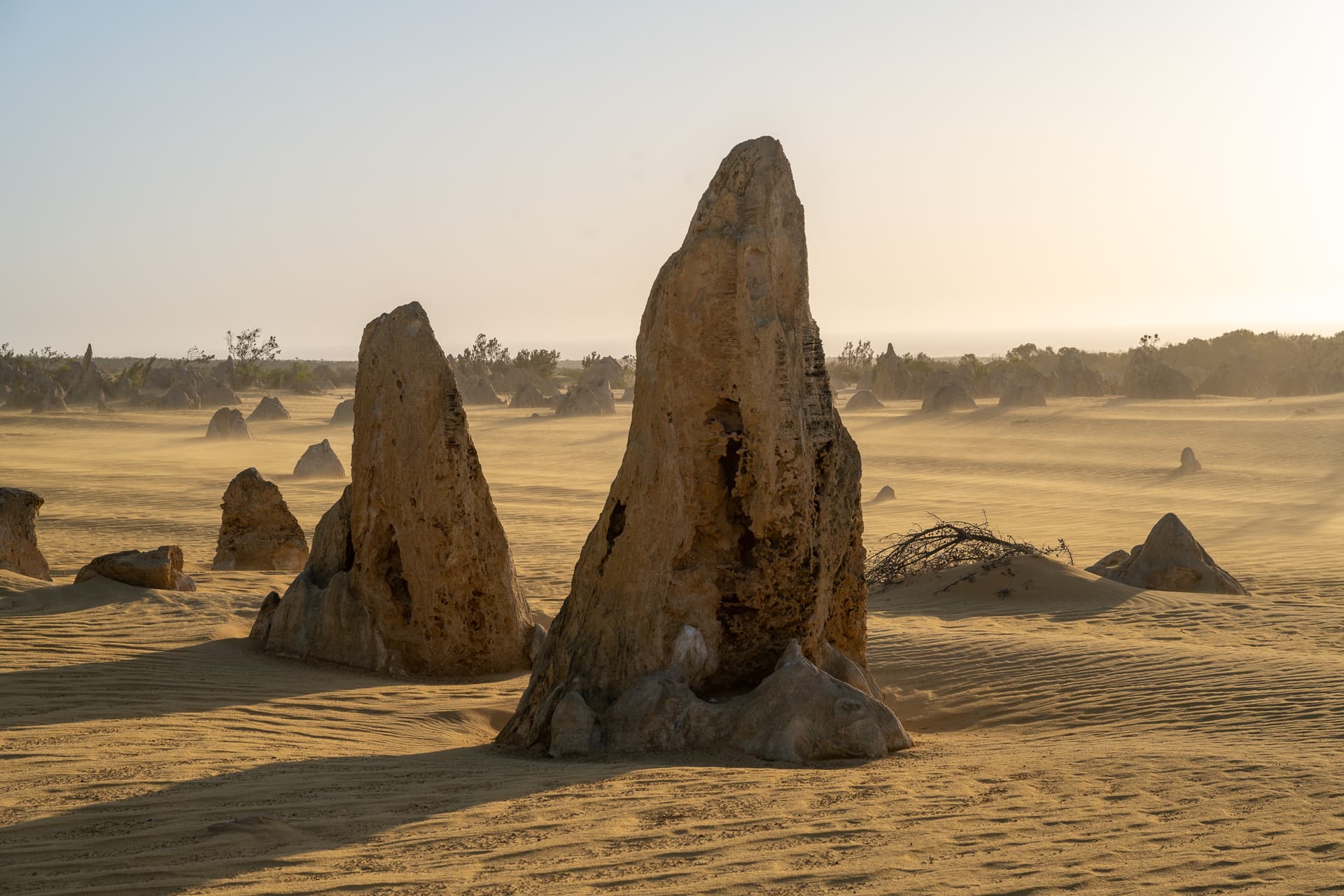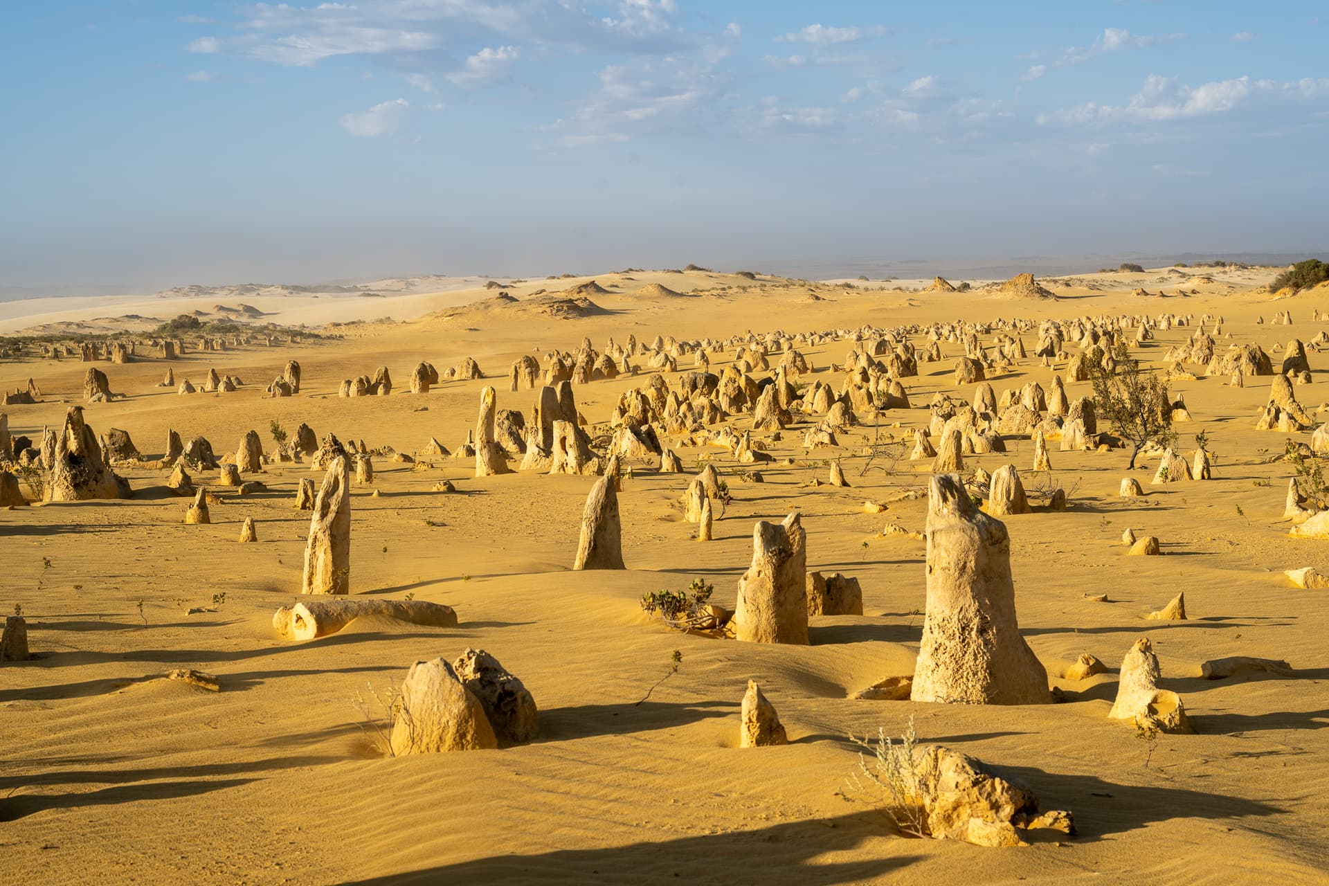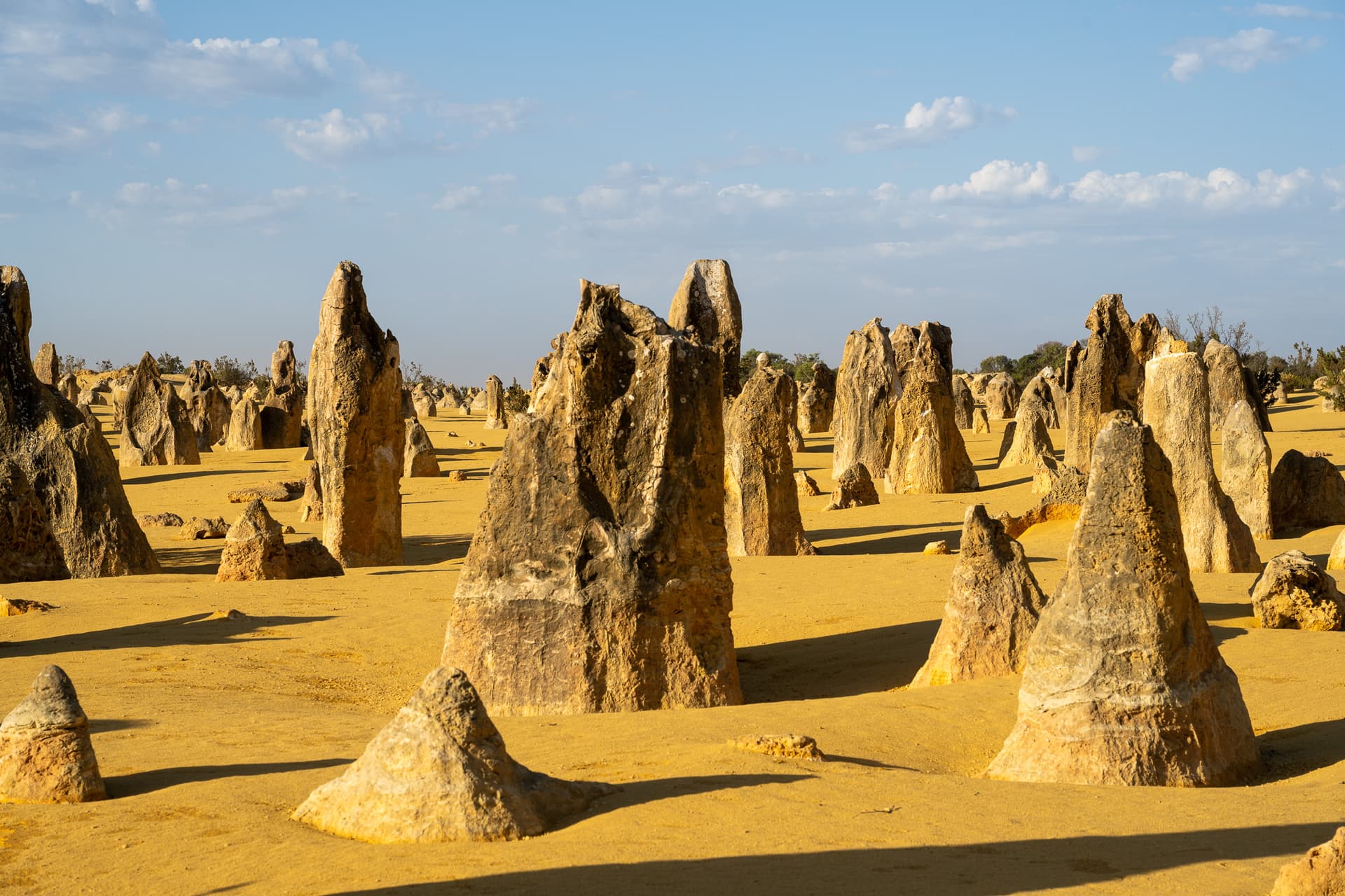 下午两点钟坐船回到Perth码头后便一刻不停地往北开,今日的下一站是Perth北边两个半小时的尖峰沙漠(Pinnacles Desert)。众所周知,美国同名的Pinnacles国家公园常年被评为最水国家公园前几名,不过澳大利亚这里的Pinnacles和美国的水货可以说是八竿子打不着——这边的尖峰来源于古海床的贝壳沉积形成的石灰岩被侵蚀的结果,甚至可以算是喀斯特地貌了,所以出片程度也自然是顶级。