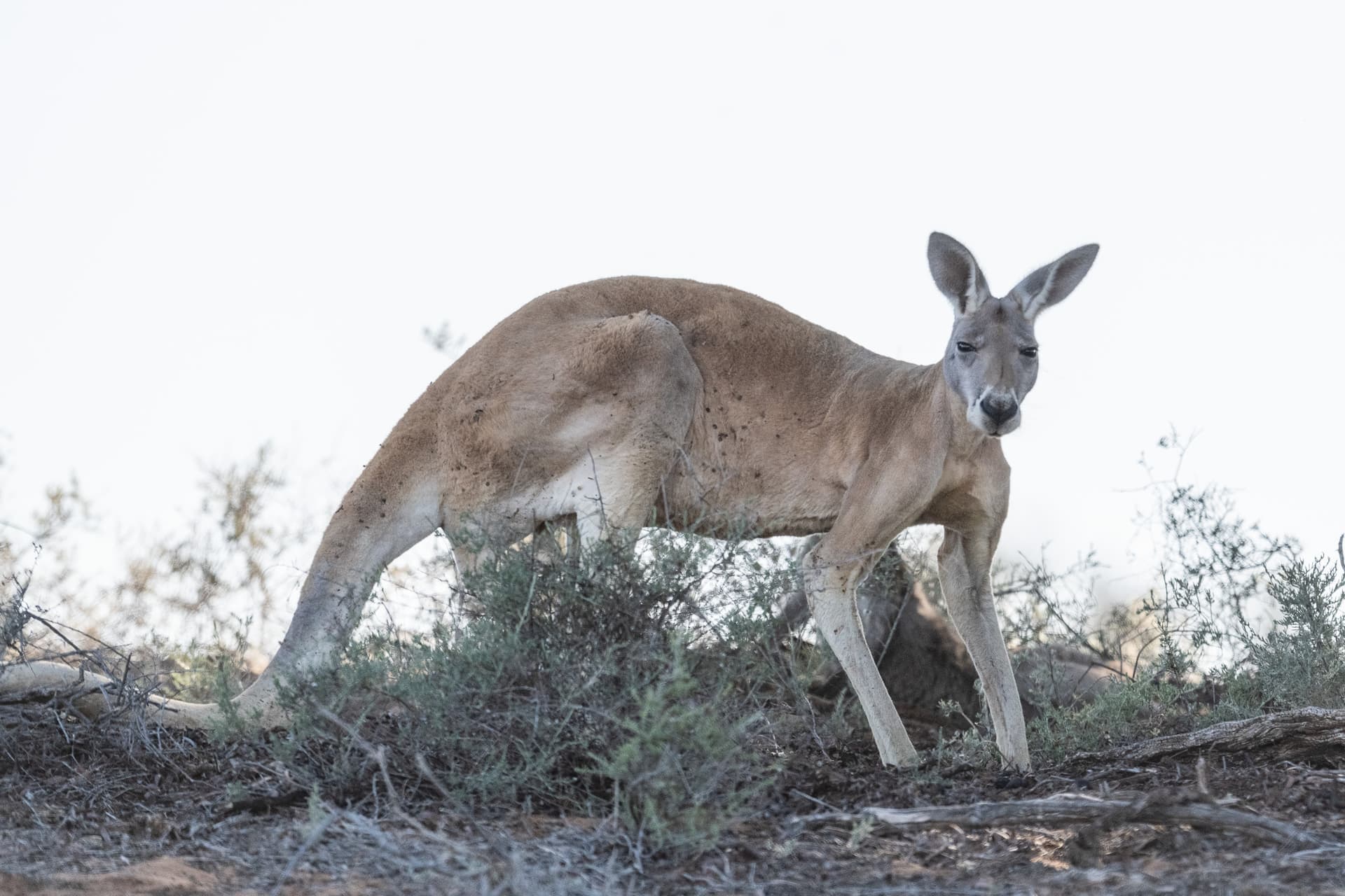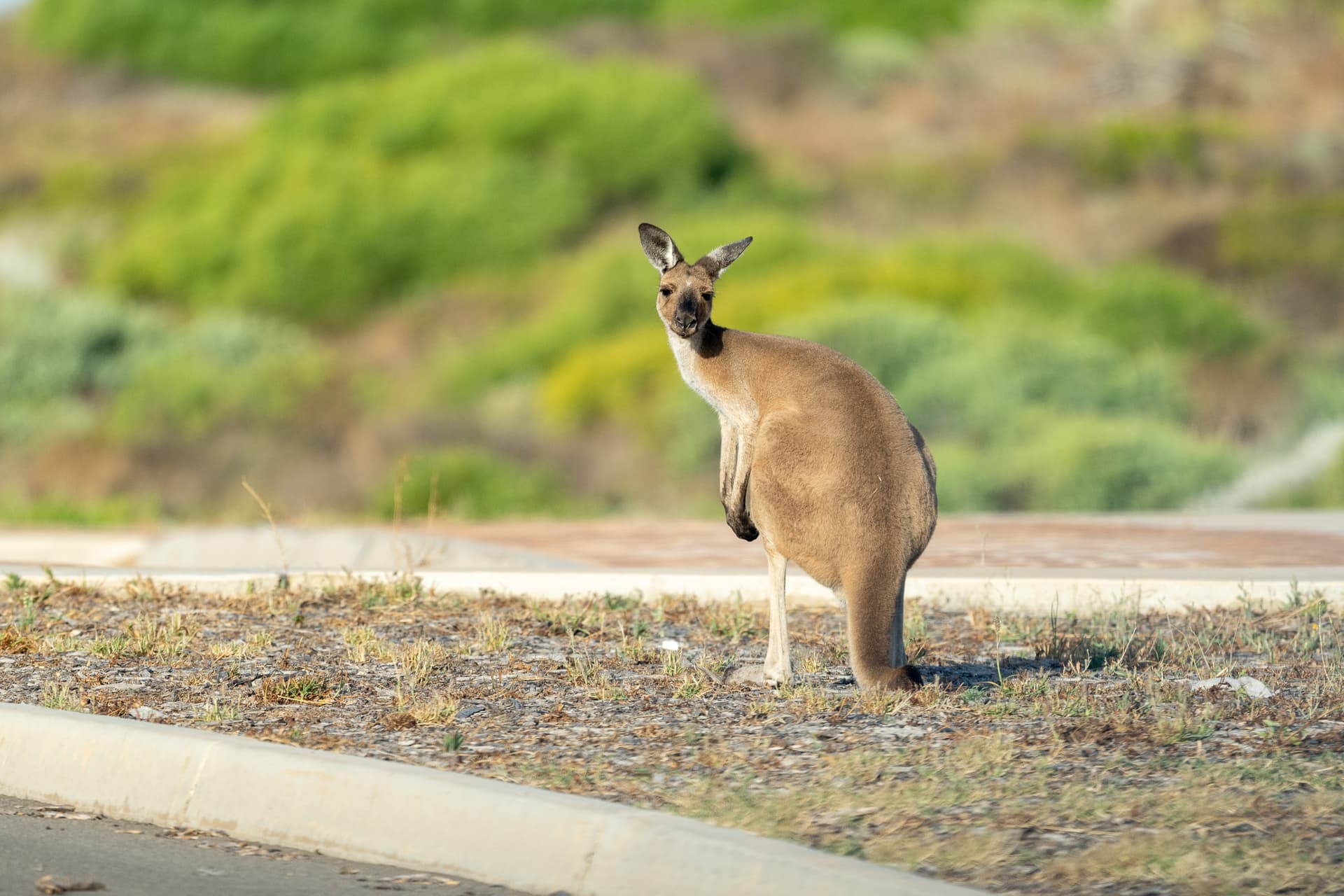 在公园里逛了一大圈,找红大袋鼠依旧未果,我们便不抱地希望开去公园北边入口逛一圈。没想到才进北入口不久,我们就在路边看到了两只体型巨大且非常警觉的袋鼠。我下车蹑手蹑脚地接近,看到红褐色的毛发与一双“白手套”,我忍着惊叫——得来全不费工夫啊,Big Red可算让我逮着了!
