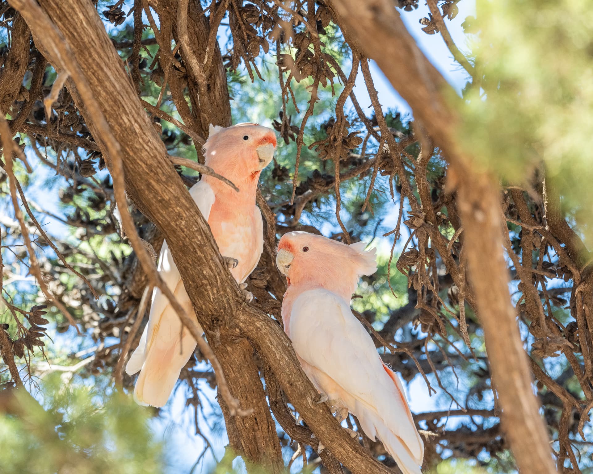 然而在树下找了一圈还是没看到红大袋鼠的身影,倒是凤头鹦鹉们个个仿佛化了妆似的脂粉气浓重。