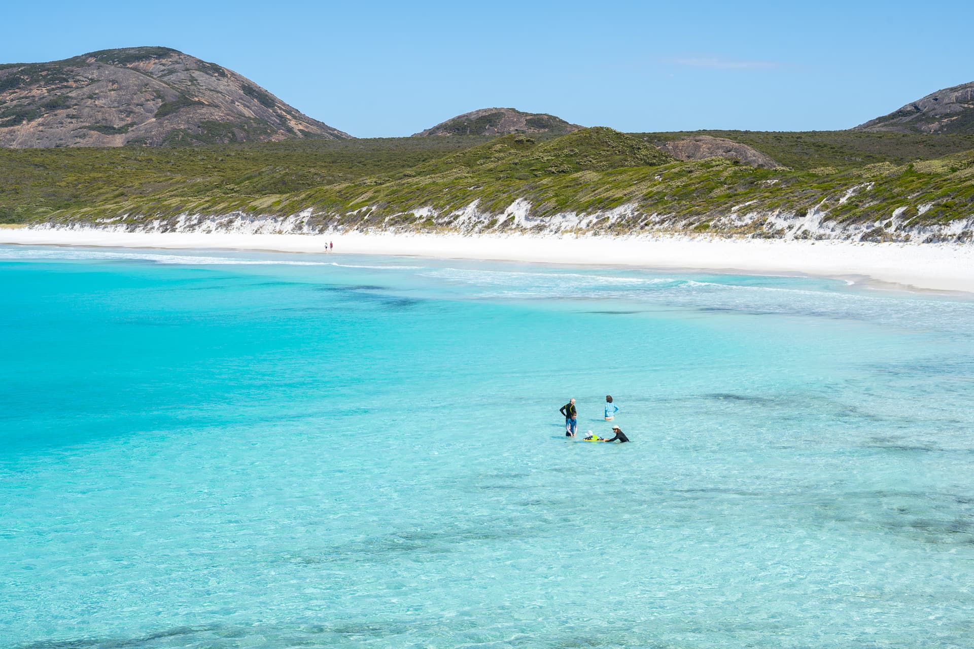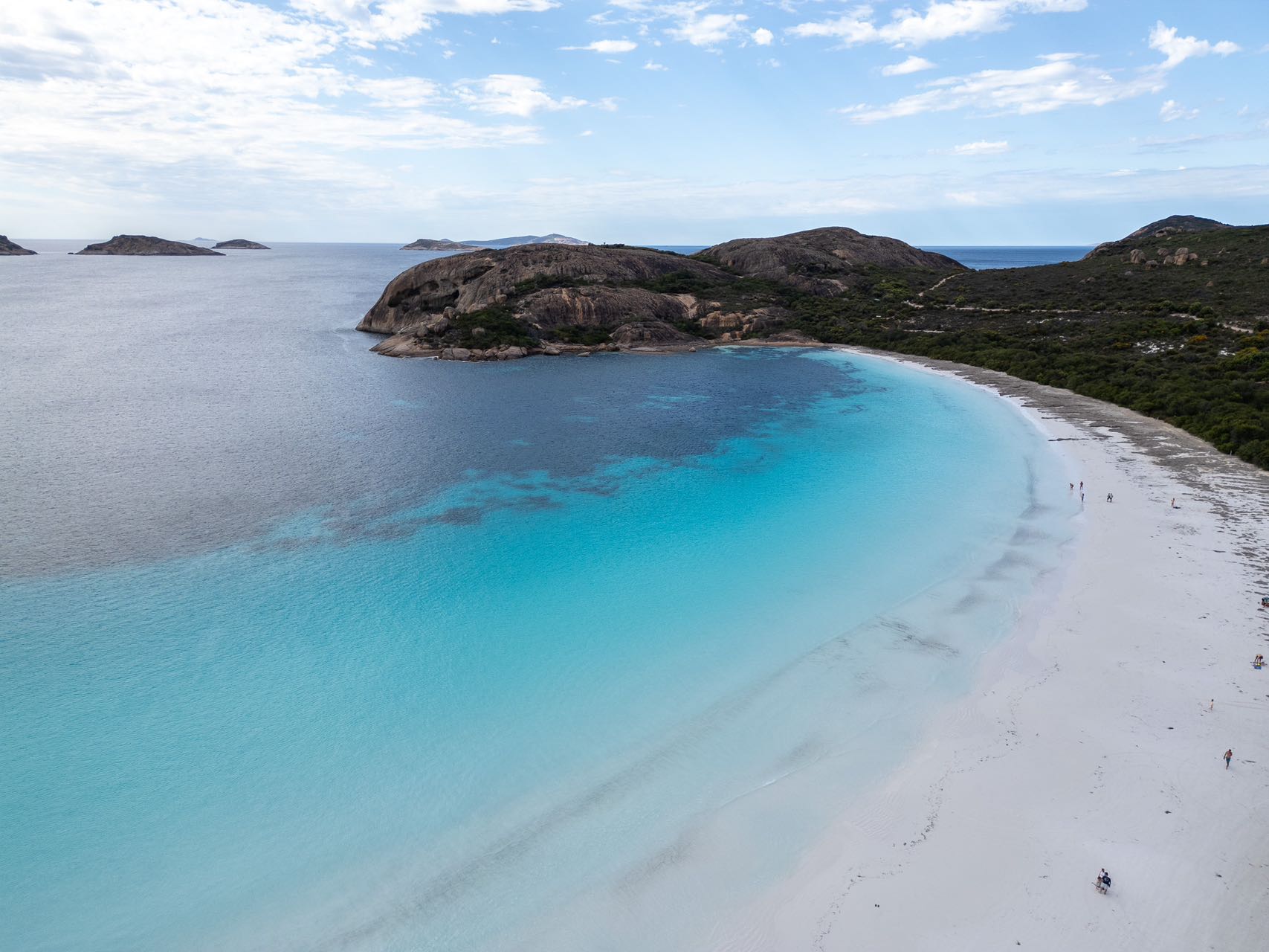 终于在早上八点之前来到了日常在世界最佳海滩评选中名列前茅的Lucky Bay,这里集合了一片壮观的海滩应有的所有元素:论沙子,这里是和佛罗里达墨西哥湾侧一样的细腻雪白沙滩,没有礁石和海草;论海水,这里清澈透亮又极致纯蓝;论风光。这里的地形又不是完全平坦,站在高出可以看到海滩完美的弧线。“天堂沙滩”真的不是言过其实。